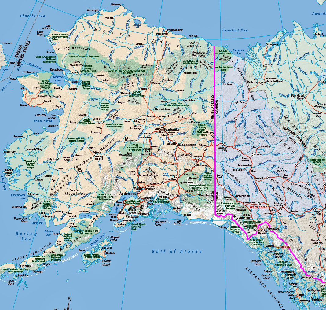 Sie sehen schon an der Karte, in die ich die Grenze pinkfarben eingezeichnet habe, dass es sich durchaus lohnt, ein Stück von Kanada mitzunehmen. Die Karte stammt von Bell´s Travel Guides. Der Verlag bietet viele hilfreiche Detailkarten, Highway-Maps und Tourenvorschläge an, die Sie für Ihre Tourenplanung hervorragend gebrauchen können. Am besten teilen Sie sich Ihre Reiseplanung auf: Machen Sie einmal drei bis vier Wochen Urlaub mit dem Anfangspunkt in Anchorage und machen Sie eine Rundtour im Uhrzeigersinn über Denali, Fairbanks, Tok nach Valdez, fahren von dort mit der Fähre nach Whittier und dann nach Anchorage zurück.