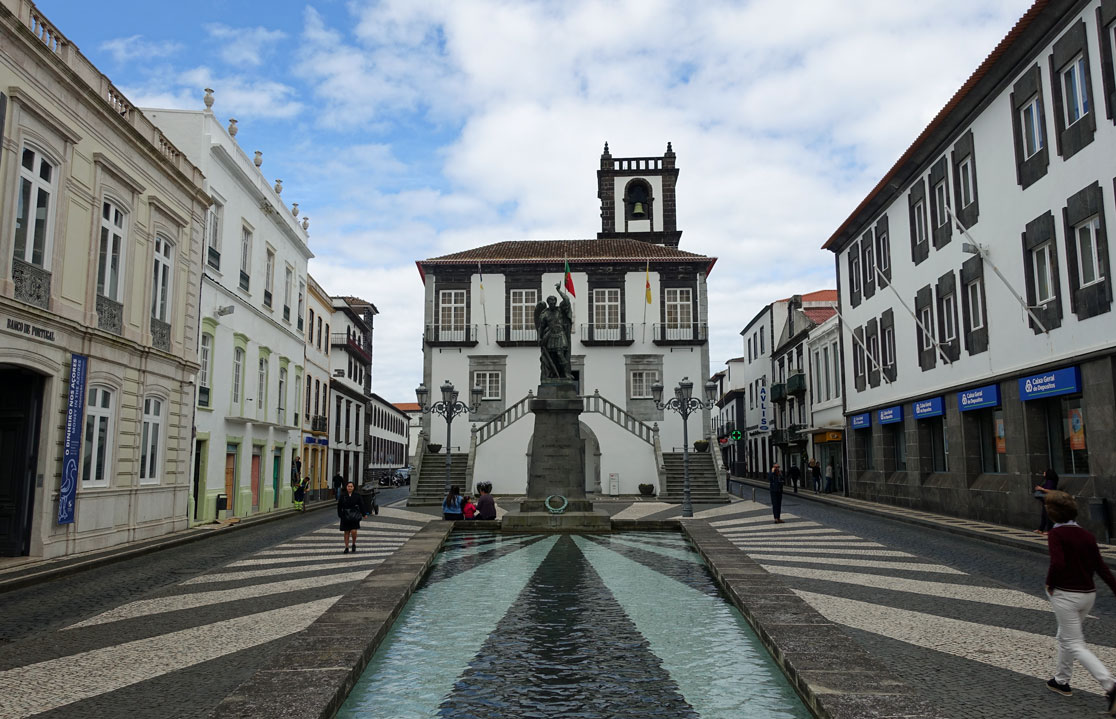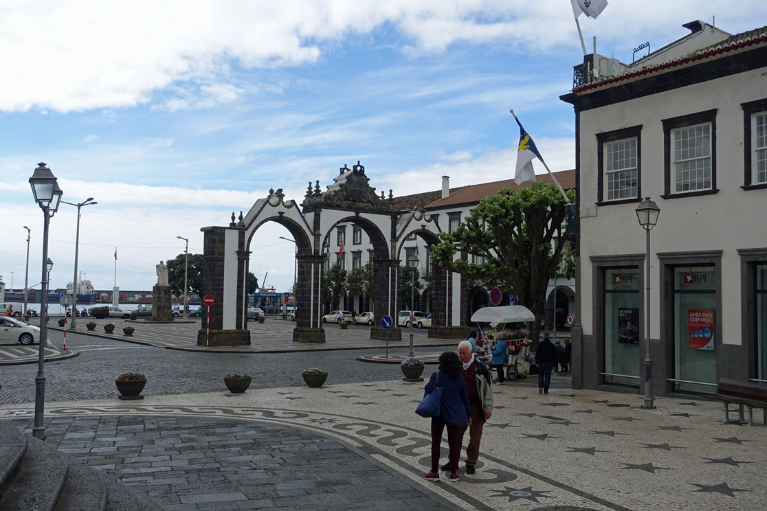 In den letzten 15 Jahren hat man den Tourismus als Einnahmequelle entdeckt, Kreuzfahrtschiffe hierhin gelockt und die Natur der immergrünen Insel für Wanderungen und Thermalbäder erschlossen. Unser Rundgang führt am Theater vorbei zum Mercado, der aber nicht besonders spektakulär ist. Total erstaunt sind wir über die sauberen Straßen. Die sind zwar alt und eng, aber nicht schmutzig. Und in den Hauseingängen und Häuserecken liegt auch kein Abfall und kein Schutt. Den Grund dafür sehen wir in der Fußgängerzone, wo ein Straßenreiniger zu Fuß gerade mit einem großen Staubsauger die Ecken saubermacht. Nachdem wir das bemerkt haben, fallen uns auch deutlich mehr Straßenreiniger auf. Die engen Straßen und Gassen sind ein echtes Problem. Die Autofahrer sind aber geduldig und keiner hupt. Sie lassen den Fußgängern immer den Vortritt. Dennoch ist es schon schwierig für beide, sich durch die engen Gassen hindurchzumanövrieren. Beeindruckend sind jedenfalls die vielen Mosaike auf den Straßen, die aus weißen Kalksteinen und grauen Granitsteinen gebildet wurden. So auch vor dem Rathaus, wo das Denkmal des Heiligen Michael steht, nach dem die Insel benannt ist. Hier einige Bilder vom Stadtrundgang: