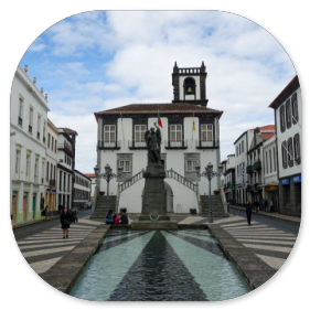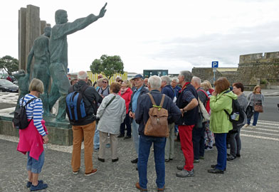Wir sind froh, dass Reiseführer Hugo die Abfahrtszeit auf 9:00 Uhr festgelegt hat. Im Bus erklärt er uns den Stadtrundgang, den er am heutigen Vormittag mit uns machen will. Dazu steigen wir am Campo Sebastião aus, wo das Auswandererdenkmal steht. Unsere Gruppe besteht aus 39 Leuten und ist vom Alter her gemischt.Hugo schildert die Geschichte der Insel und der Stadt, die Anfang des 16. Jahrhunderts nur eine kleine Fischersiedlung war. Hauptstadt wurde sie erst, als Vila Franca do Campo durch ein Erdbeben 1522 zerstört wurde. Das Fort, das danach gebaut wurde, zog viele Bauern in dessen Umgebung und man lebte vom Fischfang, von der Landwirtschaft und vom Handel. Die Insel war lange Zeit Versorgungsstation für die Schiffe, die von Portugal nach Südamerika fuhren. Eingeschleppte Seuchen und Naturkatastrophen führten aber zum Niedergang der Insel,