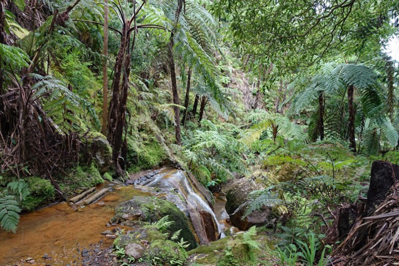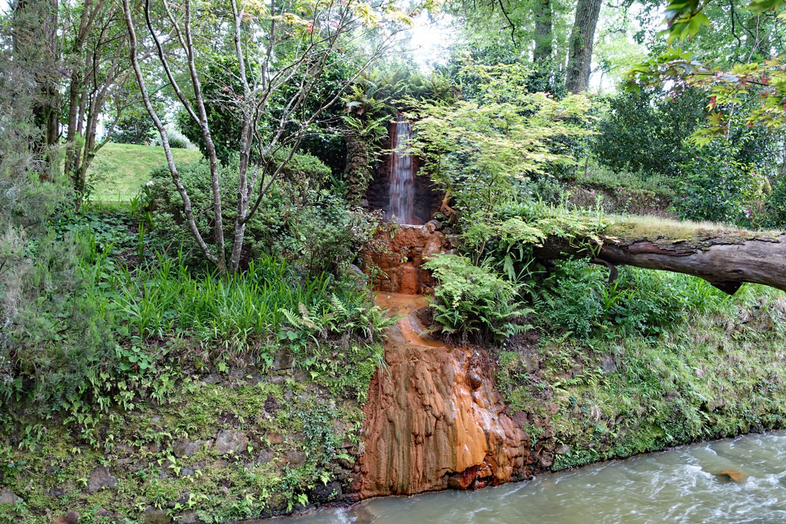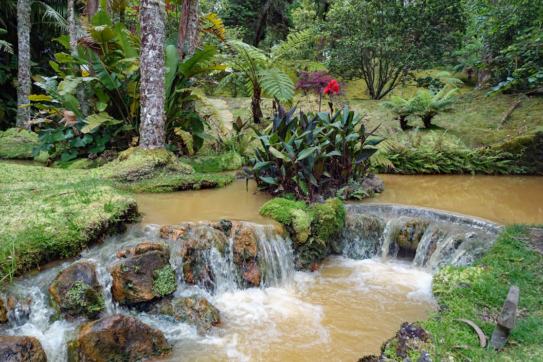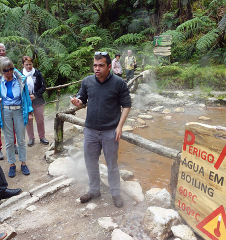 Die Naturlandschaft mit den riesigen Farnen und den tropischen Pflanzen erinnert sehr stark an Neuseeland. Der Park ist schön gestaltet mit vielen Wanderwegen, von denen einer zu einem Wasserfall führt, dessen Wasserlauf man über Fumarole geführt hat, die es auf 38°C erwärmen, sodass man in einem dort angelegten Naturbecken baden kann. Es sitzen einige Leute darin wie in einem Whirlpool und sind ganz happy. Das Wasser ist durch Eisenoxid rot gefärbt und an manchen Stellen treten Schwefeldämpfe aus. Unser Reiseführer Hugo demonstriert eine Dampffontäne, indem er seinen Zigarettenrauch in eine Öffnung bläst und dadurch eine chemische Reaktion mit den CO2-Bestandteilen seiner Ausatemluft und dem Schwefelwasserstoff der Sulfatare einen kräftigen Dampfausstoß erreicht. Er will uns nicht davon abhalten, auch ein Bad zunehmen, erklärt aber, dass sich das hier eigentlich nicht lohne, denn wir hätten ja noch eine Fahrt nach Furnas vor uns und dort sei das Thermalbecken wesentlich größer und schöner.