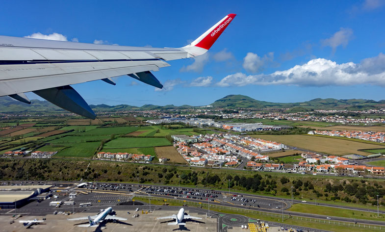 Pünktlich um 13:45 Uhr erscheint Hugo mit dem Bus, der diesmal gar nicht ganz voll wird. Am Flughafen steht eine lange Warteschlange für die Abflugschalter 7-9, an denen auch wir einchecken sollen. Das sieht schlimm aus, weil dort auch der Check-In für die Flüge nach Toronto und Boston abgewickelt wird. Jetzt merken wir erst, dass sich auch noch viele Besucher aus Amerika für die Azoren interessiert haben. Es geht aber dann doch relativ schnell voran und als wir ans Gate kommen, sehen wir schon die gelandete Airberlin-Maschine. Um 15:35 Uhr sitzen wir im Airbus 321 auf unseren Plätzen und freuen uns königlich, dass die Sitze neben uns frei bleiben. Die Flugzeit nach Düsseldorf wird mit 3 Std. 50 Min. angegeben, das Wetter ist toll und blauer Himmel über uns. Was will man mehr?Wir starten pünktlich um 15:50 Uhr, aber leider dreht die Maschine kurz nach dem Start über dem Meer ab, sodass wir nicht mehr viel von der Insel sehen, dennoch bleiben schöne Erinnerungen...