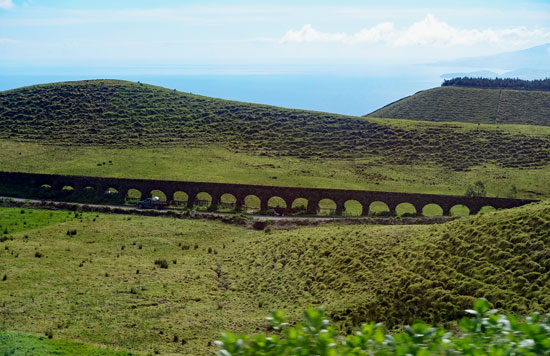 Ein Stück weiter halten wir an einem Aquädukt aus Lavasteinen und den kleinen Seen Lagoas Empanadas in einer Caldeira.