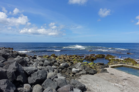 Nach einem Spaziergang durch die Stadt werfen wir noch einen Blick auf den breiten dunklen Strand und das Schwimmbad, in das gerade Wasser für die Badesaison eingelassen wird. Um die Stadt herum liegen viele kleine Badebuchten zwischen den steil abfallenden Lavaklippen. Dazu sind viele Campingplätze, Golfplätze und Spielplätze angelegt worden, um für die Bevölkerung attraktive Ausflugsziele an der Küste anzubieten.