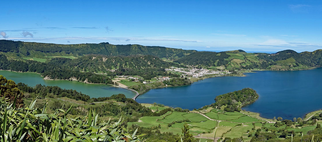 "Vista do Rei" (Königsblick) nennt man den Aussichtspunkt, an dem man den gesamten Krater mit dem Lagoa Azul und dem Lagoa Verde überblicken kann. Es stehen zwar viele Busse dort oben, weil heute ein Kreuzfahrtschiff im Hafen liegt, aber Hugo lässt uns viel Zeit zum Herumspazieren, sodass wir uns den schönsten Platz zum Fotografieren aussuchen können. Der Blick ist überwältigend; es ist wirklich ein echtes Postkartenmotiv. Ich klettere ein Stück den Hang hinauf und fotografiere von der Mauer des ehemaligen Hotels. Eigentlich ist dort unten nämlich nur ein einziger See, der durch eine Brücke in zwei Hälften getrennt wurde. Durch die unterschiedlichen Algen und Mikroorganismen erscheinen die Teile andersfarbig. Ein Stückchen weiter halten wir noch einmal am Miradouro Cerradas das Freiras, wo ich ein Panoramafoto versuche. Hier der Blick auf den Lagoa Azul und den Lagoa Verde vom Miradouro Cerradas das Freiras: