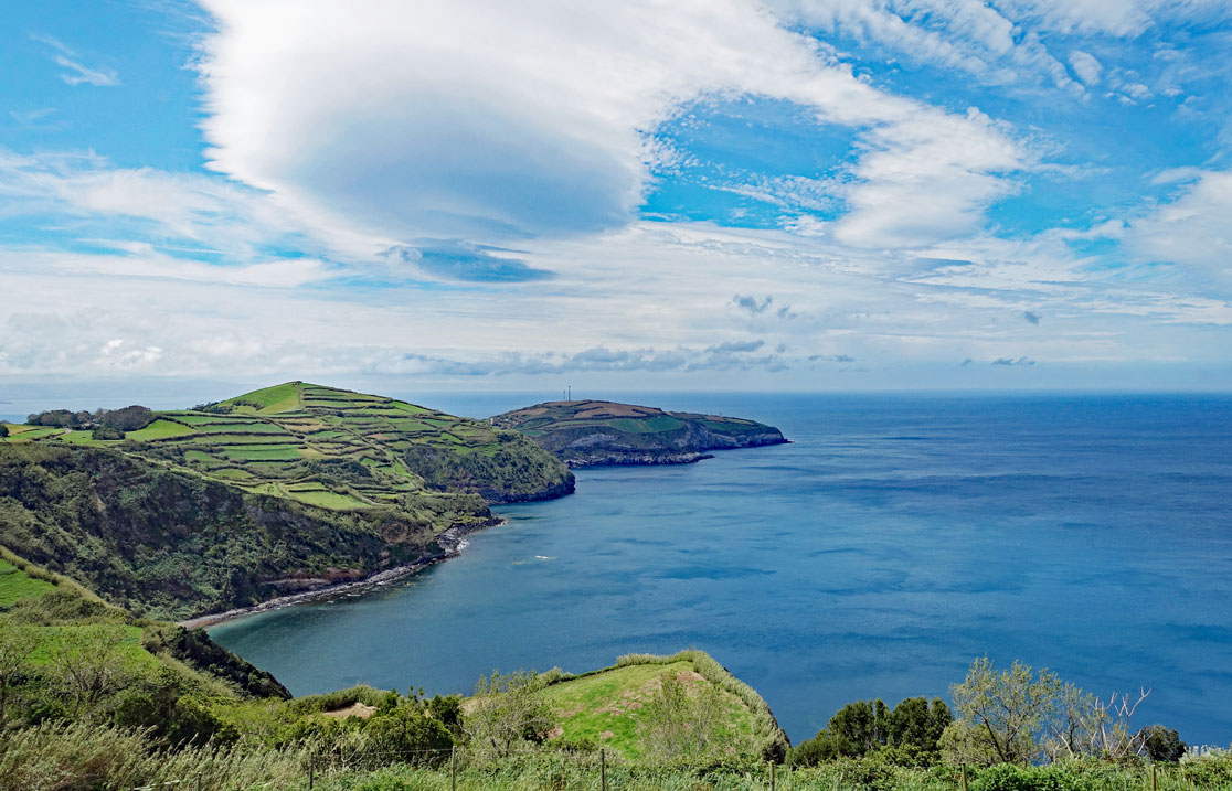 Die Fahrt geht weiter zur Ponta do Escalvado, einem Aussichtspunkt an der Westseite der Insel. Von dort kann man über die Steilküste auf die Bucht und den Ort Mosteiros hinüberblicken.