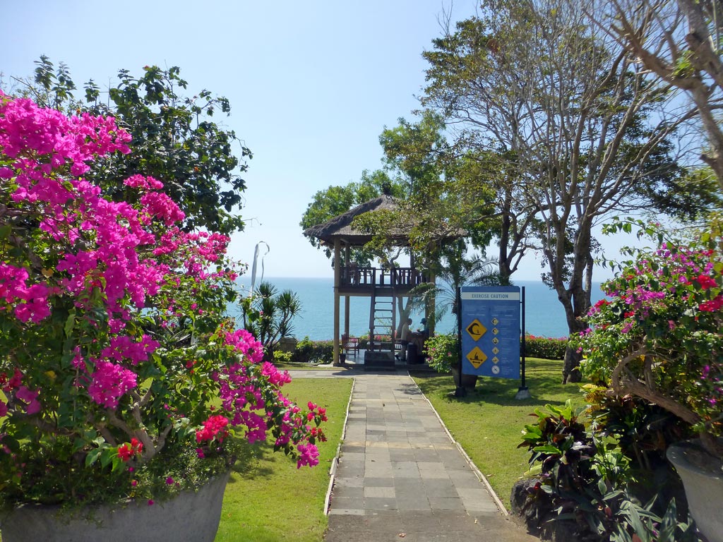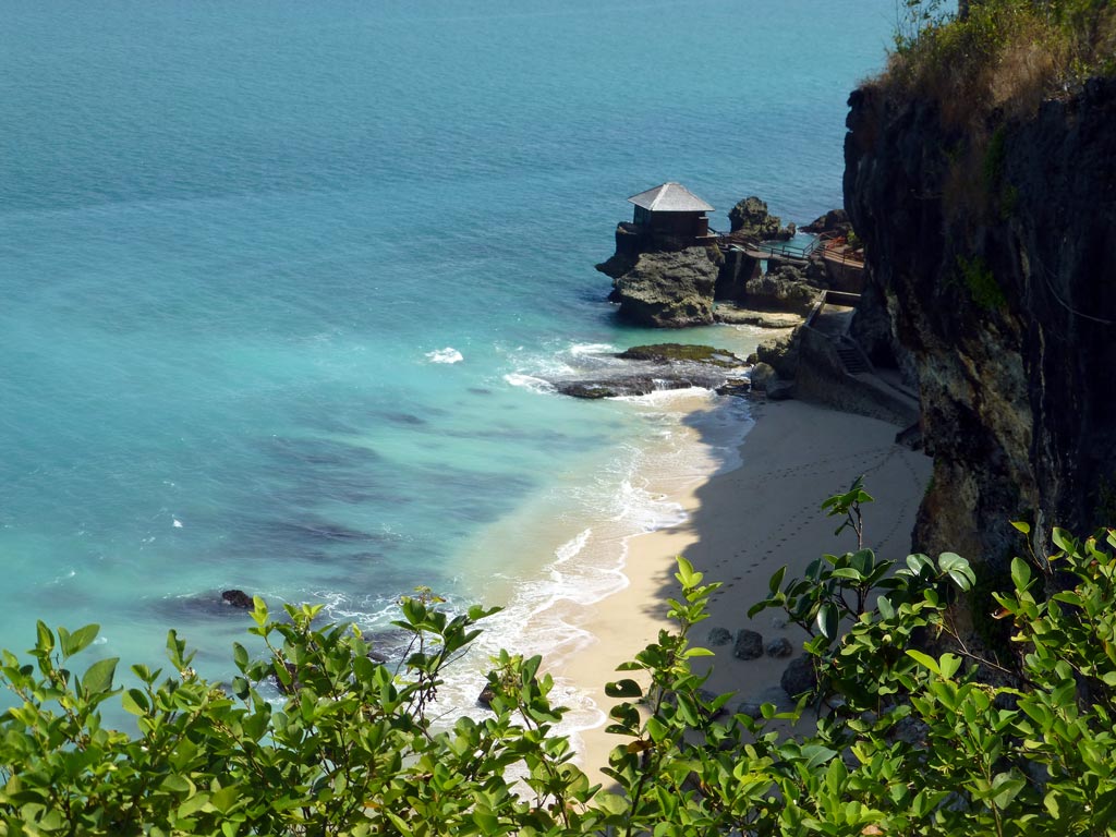 Inzwischen haben wir auch die Gegend erkundet. Unsere Annahme, dass hier im Ayana nur Pools von Interesse sind, war nicht richtig, denn als wir uns mit dem Buggy zum Kubu-Beach fahren lassen, finden wir dort eine wunderschöne Bucht unterhalb der Felsen, die auch zum Resort gehört. Man muss zwar 190 Stufen hinunter und hinauf klettern, aber unten entdeckt man eine ordentliche Dusche, eine gepflegte Toilette, bequeme Liegen im Schatten und einen tadellosen Sandstrand ohne Unrat oder angeschwemmtes Grünzeug.