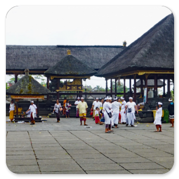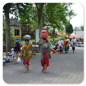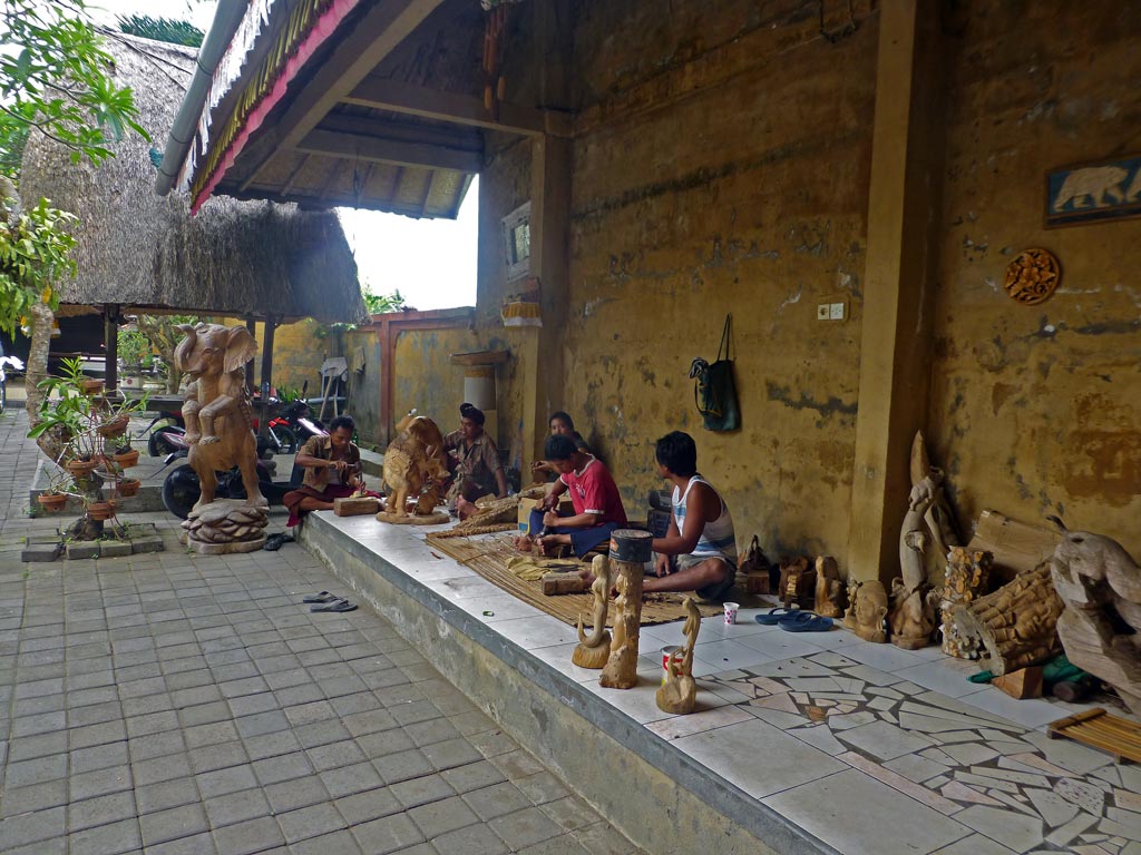 Wir fragen Kerji, warum hier um diese Touristenattraktion die Straßen und Parkplätze so schlecht gewartet werden und die Gebäude und Anlagen so wenig attraktiv aussehen, wo doch hohe Eintrittsgelder verlangt werden und alle von dem Touristenstrom so gut leben können. Er erwidert uns, dass die Dörfer von ihren Einnahmen 50% an den Staat abgeben müssen, sie schicken das Geld nach Jakarta und hoffen vergeblich, dass jemand ihre Dorfstraße erneuert. Die Korruption ist ungeheuer hoch und das Geld verschwindet in unerfindlichen Kanälen. Als wir durch ein Dorf fahren, sehen wir auf einem Feld eine enorme Ansammlung von Mopeds und Männern, die beim Hahnenkampf zuschauen und wetten. Das Polizeifahrzeug vor uns hält links an und unser Reiseleiter, erklärt uns, dass die Polizisten einen Bonus bekommen, damit sie wegschauen und weiterfahren.So biegt halt jeder sein Recht zurecht. Und im Verkehr geht es auch so zu. Einbahnstraßen gelten nur für den, der sie sehen will. Überholverbote oder andere Regeln ebenfalls. Aber seltsamerweise funktioniert es und wir sind total erstaunt, dass wir auf unseren Fahrten keinen einzigen Unfall gesehen haben. Man muss es auch irgendwie der balinesischen Gelassenheit zuschreiben, die sich einfach in die Gegebenheiten fügt und das Beste für sich daraus herausholt.