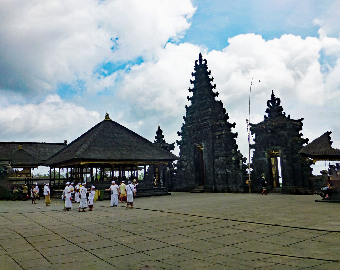 Unser Reiseführer erklärt uns, dass hier in diesem riesigen Tempelkomplex von mehr als 200 Gebäuden jedes alte Adelsgeschlecht von Bali einen eigenen Bezirk hat. Jedes Dorf und jede bedeutende Familie hat Schreine und Altäre errichtet, über die ihre Tempel mit dem Muttertempel Pura Besakih verbunden sind. Wir steigen die unzähligen Treppen hoch und er zeigt uns auch den Ahnentempel seiner Familie. Drinnen stehen Priestergruppen und sorgen dafür, dass die Opfergaben verschwinden bzw. in bare Münze umgetauscht werden. Ungläubige (wie wir) dürfen gar nicht in diese Opferbereiche. Unser Guide hat uns für dieses Foto schon schwer zurück gepfiffen und vor der Touristenpolizei gewarnt. Geopfert und gebetet wird jeden Tag für alles und jedes. Aber die Art und Weise der Opferung ist anders als in Indien oder Thailand, die ja die Mutterländer dieser Kultur hier sind. Dort sind die Tempel fantastisch in Ordnung und die Gläubigen begegnen ihren Göttern anders. Die Menschen haben in Bali halt einen sehr seltsamen animistischen Glauben, an den man sich erstmal gewöhnen muss.