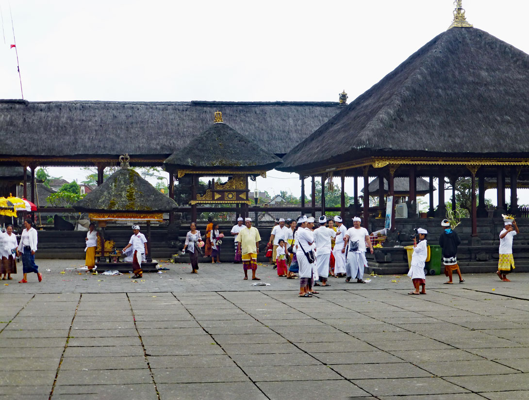 Aus diesem Grunde pilgern sie jedes Jahr hierhin und bringen der Göttin Dewi Danu, die über Seen und Flüsse herrscht, ihre Opfer dar. Dann schöpfen sie Wasser aus dem See, lassen es von den Priestern segnen, nehmen es mit nach Hause und besprengen in ihren Dörfern die Reisfelder. Als wir in den Innenhof des Heiligtums blicken, findet gerade eine solche Segnung statt. In dem Video sieht man den Auszug der Priester und Reisbauern.