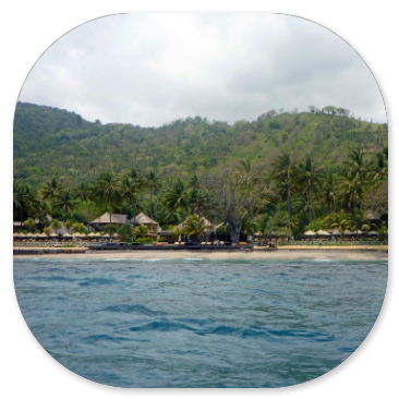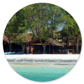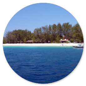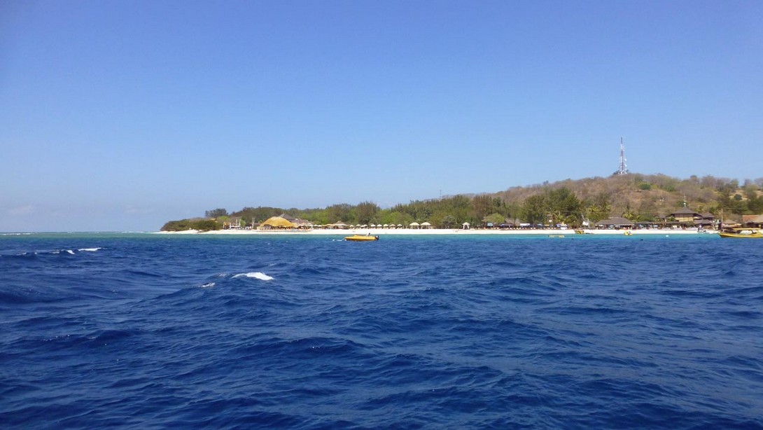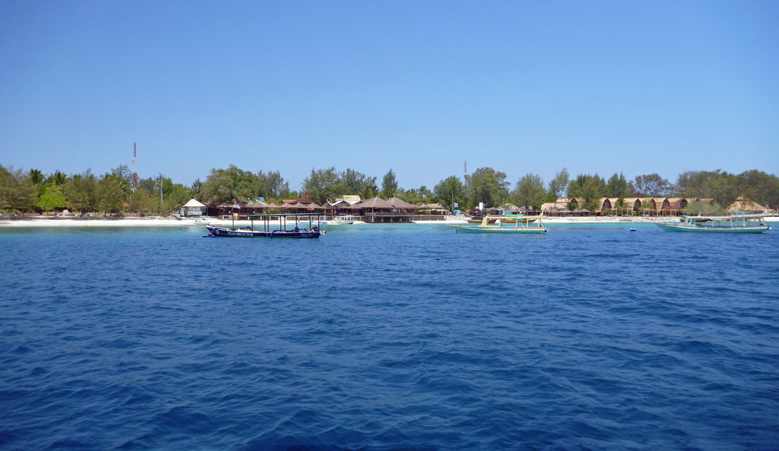Nach gut einer Stunde Fahrt mit kräftigem Wellengang erscheinen vor uns die drei Inseln Gili Terawangan, Gili Meno und Gili Air.