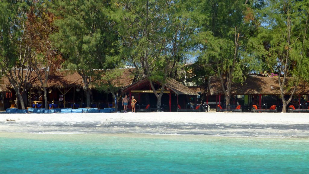 Gili Terawangan mag früher ein Geheimtipp gewesen sein, jetzt ist sie jedenfalls ziemlich überlaufen. Als wir (mit vielen anderen Booten übrigens) dort ankommen, sehe ich Hubschrauberrundflüge, Glasbottom Boats und viele Ausflügler außer den dort in Hotels wohnenden Gästen. Es erinnert mich stark an die Phi-Phi-Inseln in Thailand, die von allen Touristen als Ausflugsziel angesteuert werden. Als wir die Insel umrunden, entdecke ich einsame Hütten mit Individualtouristen, andererseits aber auch Hotels und Backpacker-Cafés mit regem Betrieb. Der Sand am Strand ist feinsandig und hell, das Wasser davor türkisgrün und sauber. Mein Bootsführer rät mir, hier zu schnorcheln, weil das Wasser klar sei und die anderen Touristen auch hier schnorchelten. Ich falle auf diesen Hinweis herein und finde ein total totes Korallenriff mit einigen winzigen Butterflies, Triggerfischen und Doktorfischen.