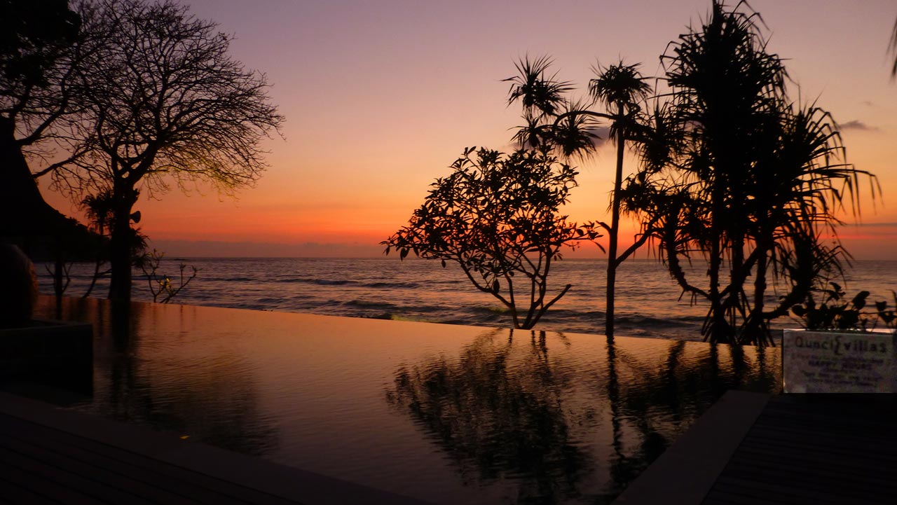 Unser erster Eindruck in den Qunci Villas: Blick über den Pool nach dem Sonnenuntergang