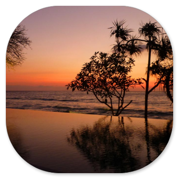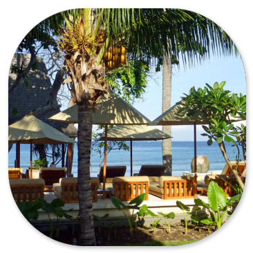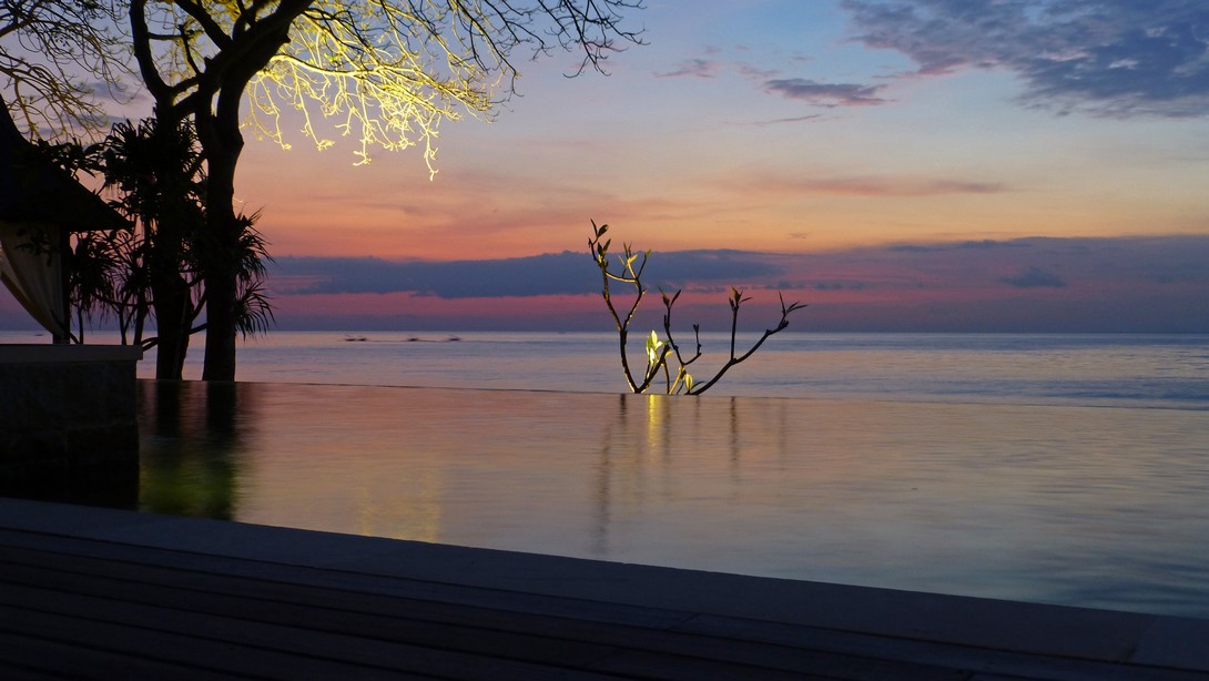 So sitzen wir bei der Happy Hour am Meer oder am Pool, schlürfen einen der leckeren Drinks zum halben Preis und schauen fasziniert übers Meer, wenn am Horizont die Sonne darin versinkt und der Gunung Agung (der 3100 m hohe heilige Vulkan auf Bali) in 35 km Entfernung als Silhouette erscheint.