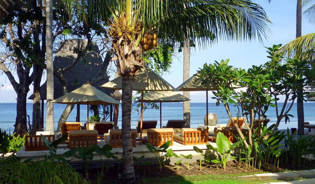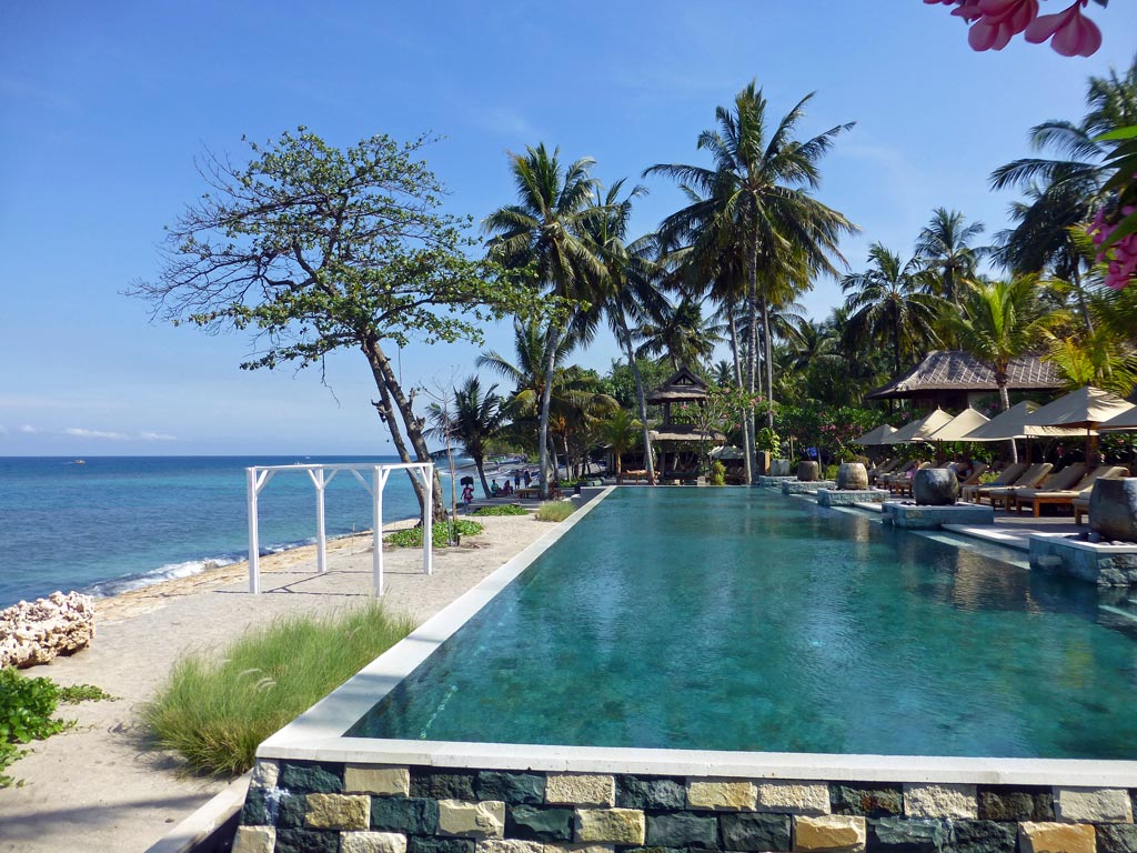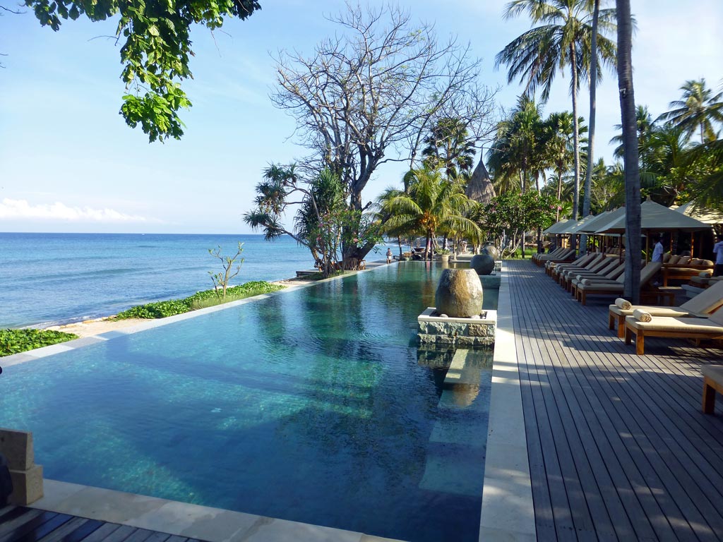 Es ist schönes Wetter und die Liegen zwischen unserer Villa und dem Pool sind noch alle unbenutzt. Auch um 10:00 Uhr sind erst 2 belegt und es sitzen nur 2 Pärchen beim Frühstück. Man kann mit Blick aufs Meer im Garten oder im Restaurant frühstücken. Es wird kein Büffet angeboten, aber alle Wünsche nach andersartiger Zusammensetzung als den angegebenen Frühstücksarten (indonesisch - französisch - australisch - amerikanisch) werden erfüllt.