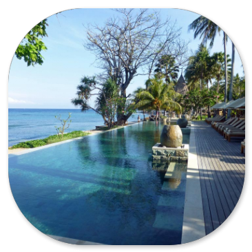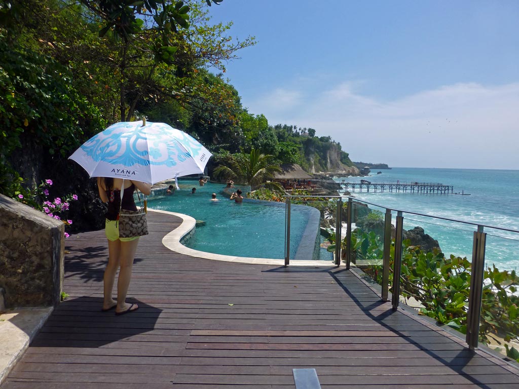 Aber wenn es einem zu heiß wird, geht man einfach ins Wasser. Dazu gibt es mehrere unterschiedliche Poolanlagen. Wir sind immer wieder begeistert von der Blumenpracht, die ein Heer von Gärtnern in Ordnung hält. Es ist in der Tat eine Anlage, die ihre 6 Sterne verdient hat. Wer Interesse hat, sollte sich das einmal alles im Internet anschauen: https://www.ayana.com/bali/ayana-resort-and-spa. Ich habe auch eine Beurteilung des Hotels im Tripadvisor und bei Holidaycheck veröffentlicht. Obwohl wir sehr komfortabel wohnen, kann man hier durchaus neidisch werden, wenn man z.B. sieht, wo andere Gäste wohnen: Es gibt viele Villen mit eigenem Pool, großem Garten, Butler und einer traumhaften Badezimmerlandschaft. Wer sich das leisten kann, kann in der Tat einen Traumurlaub im Paradies verbringen.Auffallend ist die Freundlichkeit des Personals, wir werden mit unserem Namen begrüßt, jeder Wunsch wird umgehend und perfekt erfüllt. Es ist natürlich alles eine Frage des Preises.