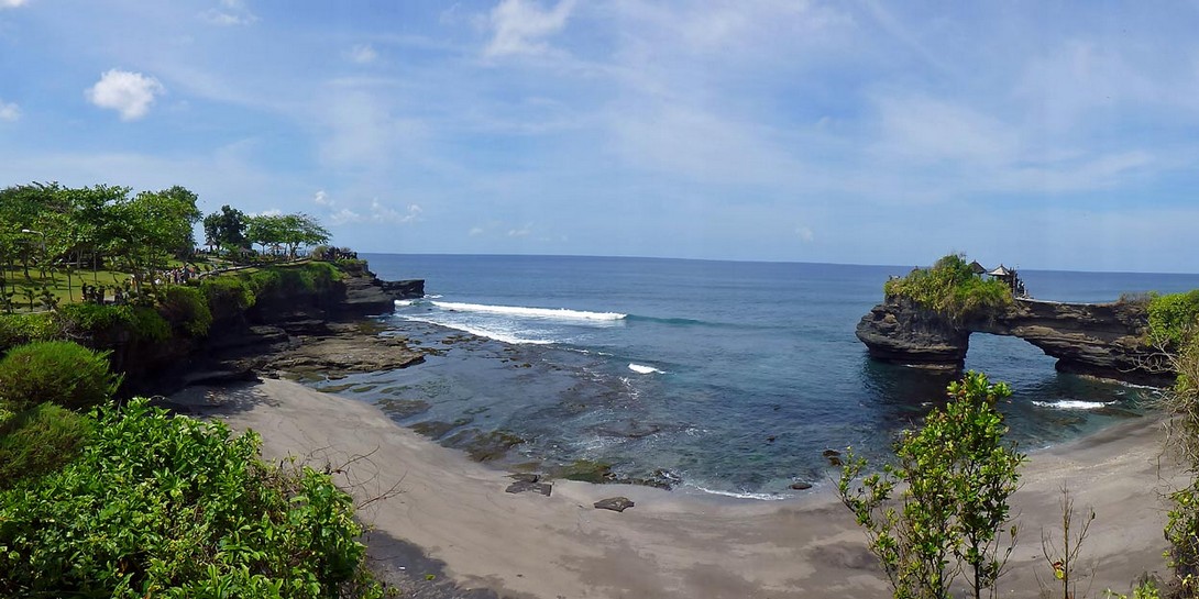 Der kleine Tempel auf dem Felsvorsprung sieht ziemlich erbärmlich aus. Bei Flut wird die Klippe von der Brandung umspült, sodass es optisch wirksamer ist. In den Felsen selbst entspringt eine Süßwasserquelle, die als Touristen-Verkostungsstelle natürlich viel Geld einbringt. Gegenüber haben sich in den Felsen durch die jahrhundertlange Arbeit des Meeres kleine Höhlen ausgebildet, in denen die heiligen Seeschlangen leben. Auch hier wacht ein Priester vor dem Schlangenloch und ist bereit, für 10 000 Rupien die Schlange hervorzulocken, damit man sie berühren kann.