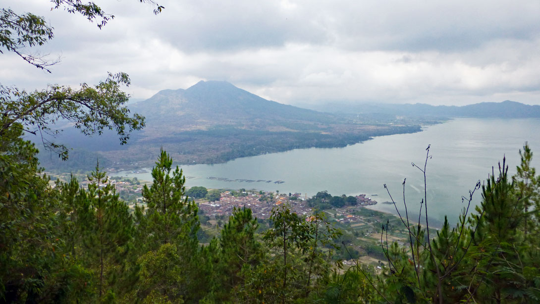 Anschließend geht es weiter ins Gebirge zum Gunung Batur und dem Batur See. Am Aussichtspunkt oben in 1400 m Höhe ist es angenehm kühl, aber leider auch sehr diesig und bewölkt, sodass wir auf schöne Fotos verzichten müssen.