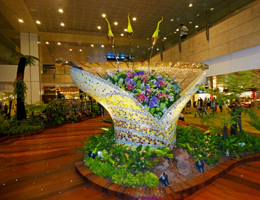 Der Flughafen ist nicht umsonst einer der schönsten der Welt: Orchideengärten empfangen uns; überall auf den Gängen blüht es, dazwischen gibt es farblich gestaltete Ruhezonen und Sanctuarien.