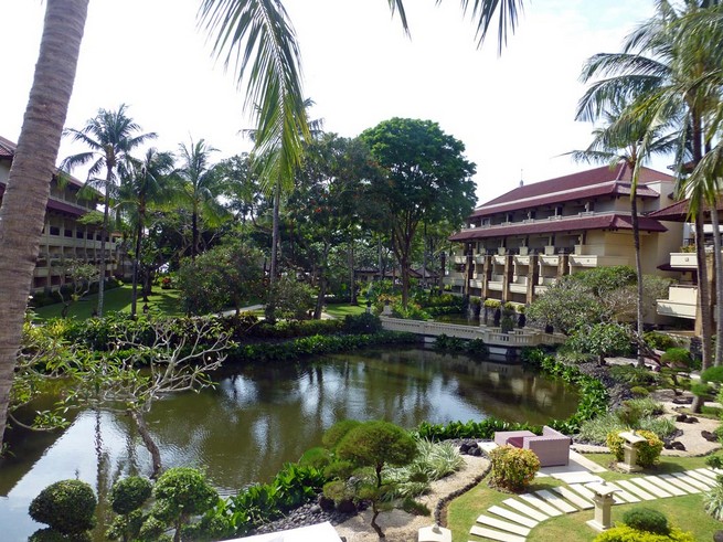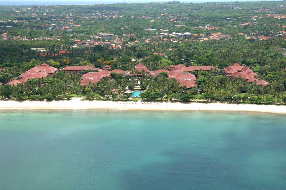 Die Luftaufnahme zeigt sehr gut die Anordnung der Wohnblöcke und die Lage des großen Pools in der Mitte. Obwohl die Anlage schon 26 Jahre alt ist, ist sie sehr gepflegt, etwas altertümlich, hat aber Charme und verdient durchaus ihre 5 Sterne. Allerdings vermissen wir den Blütenreichtum des Ayana Resorts. Bei unserem ersten Rundgang erscheint uns alles sehr ruhig und träge. Es ist windstill, heiß und überall liegen dickbäuchige Europäer, fette Russen oder ältere Leute auf den dick gepolsterten Liegen, von denen kaum eine frei ist. Alle scheinen schläfrig und antriebslos zu sein, am Strand macht keiner Sport, es ist keiner im Wasser, es ertönt keine Musik und man hört keine schreienden Kinder.