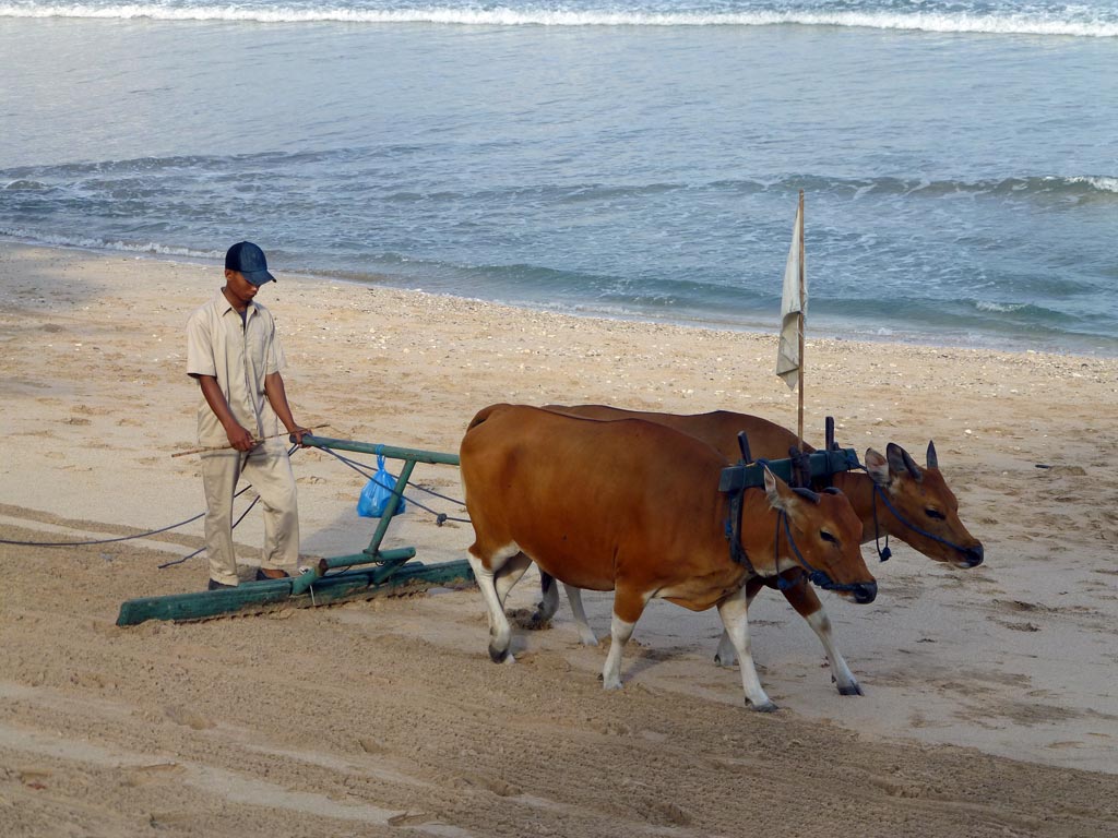 Der Strand wird morgens mit einem Ochsengespann gereinigt.