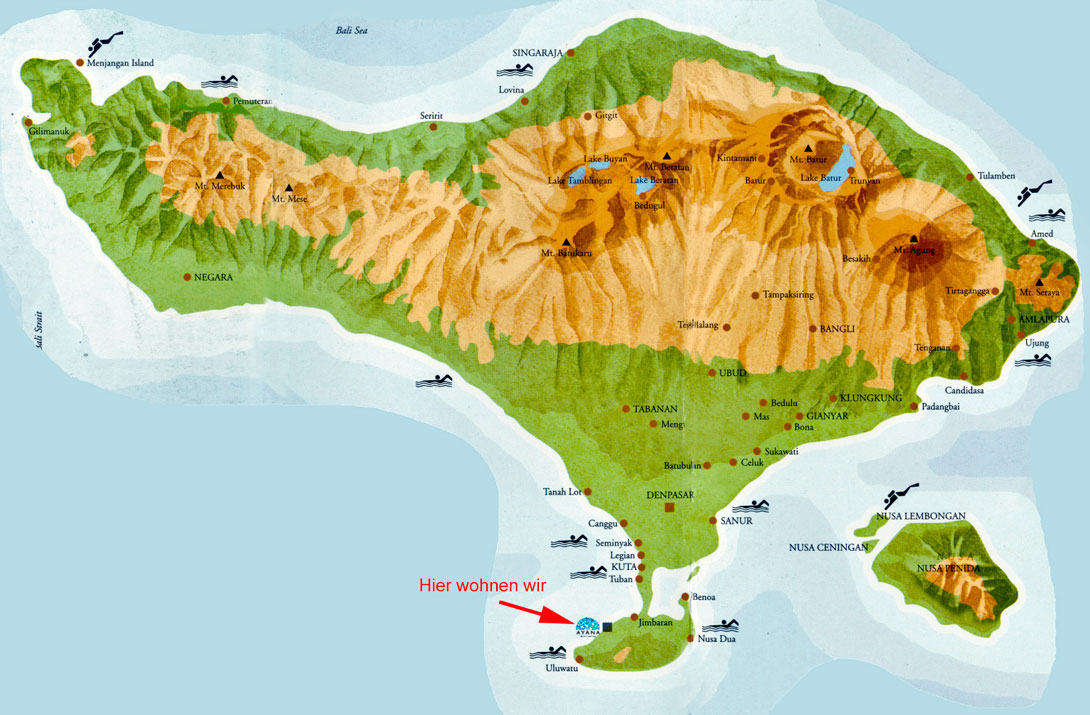 Auf dem unteren Zipfel der Insel Bali wohnen wir jetzt, 20 km südlich von Denpasar. Der Fughafen ist auf der schmalen Landzunge . Nicht weit weg von dem Ayana Resort liegt Jimbaran.
