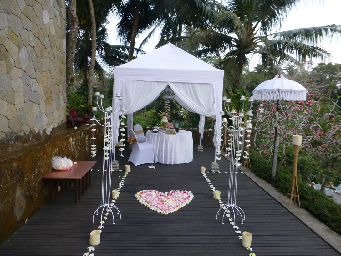 Wie alle anderen Hotels bietet das Ubud Maya auch Festdekorationen zu einem romantischen Dinner zu zweit, zur Hochzeit oder zu Geburtstagsfeiern an. Wir sind immer wieder erstaunt, mit welchem Aufwand die Tische gedeckt werden und wie schön alles geschmückt wird. Das ist auch hier der Fall, wo sich ein Pärchen ein Candlelight-dinner gewünscht hat. Die Kompositionen sind nicht billig, aber perfekt gemacht. Wir hatten am Nachmittag beim Schmücken zugeschaut, weil alles auf der Plattform oberhalb des Pools aufgebaut wurde.