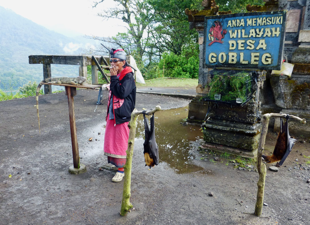 Er hat uns allerdings hierhin gelockt, weil oben zwei seiner Freunde stehen, die einen Waran und einen fliegenden Hund zur Schau stellen. Wir sollen uns unbedingt mit der Echse und der Fledermaus fotografieren lassen. Als wir darauf verzichten, schmollt er. Wahrscheinlich ist er sauer, dass er heute an uns nichts verdient hat.