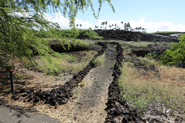 Überall sind schwarze Lavamassen zu sehen. Die haben aber auch ihren Reiz. Wenn Sie die Insel und den Volcanoes National Park mögen, müssen Sie sich entscheiden, wo Sie Ihr Quartier aufschlagen. Da ist einerseits Hilo natürlich sehr günstig das 45 km nördlich vom National Park liegt, weil Sie von dort sehr schnell in Pahoa sind, wo die Lava über die Straße geflossen ist und zuletzt auch im Mai bis September 2018 der Lavafluss des Kilauea seine gewaltigen Spuren hinterlassen hat. Andererseits lohnt sich auch ein Hotel oder Condo in Kailua-Kona, weil das sehr zentral liegt und man von dort bequem alle Sehenswürdigkeiten der Insel erreichen kann. Das Städtchen hat Flair - und die Umgebung auch. Die Anfahrt zum Park dauert dann aber 2 1/2 Stunden. Für den Ausflug in den Volcanoes National Park müssen Sie mindestens einen ganzen Tag einplanen, weil Sie auf der Küstenstraße nicht schnell vorankommen und hier sowieso alles etwas gemächlicher abläuft als auf den anderen Inseln. Die Wanderung über die Lavamassen ist ein Erlebnis. Im Hintergrund des Bildes können Sie die dampfende Rinne der fließenden Lava erkennen. Sie können auch zu der Stelle wandern, wo die Lava über die Straße geflossen ist.