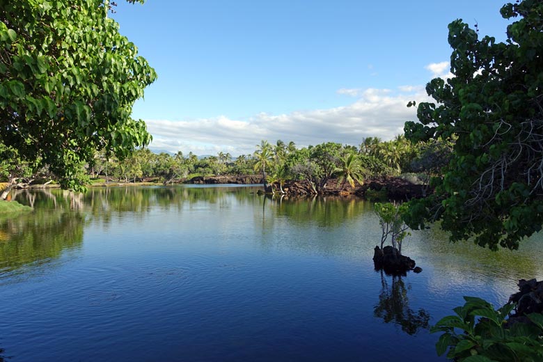 Hinter den Sandstränden verbergen sich oft Süßwasserponds, in denen seltene Fische, Muscheln, Krebsarten oder Vögel. ihre Heimat finden. Hier ein Bild vom Fischteich am Mauna Lani Hotel.