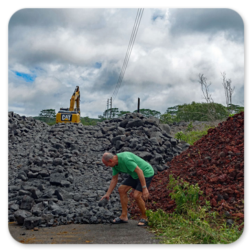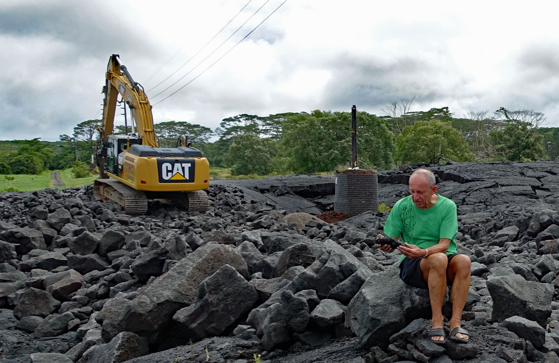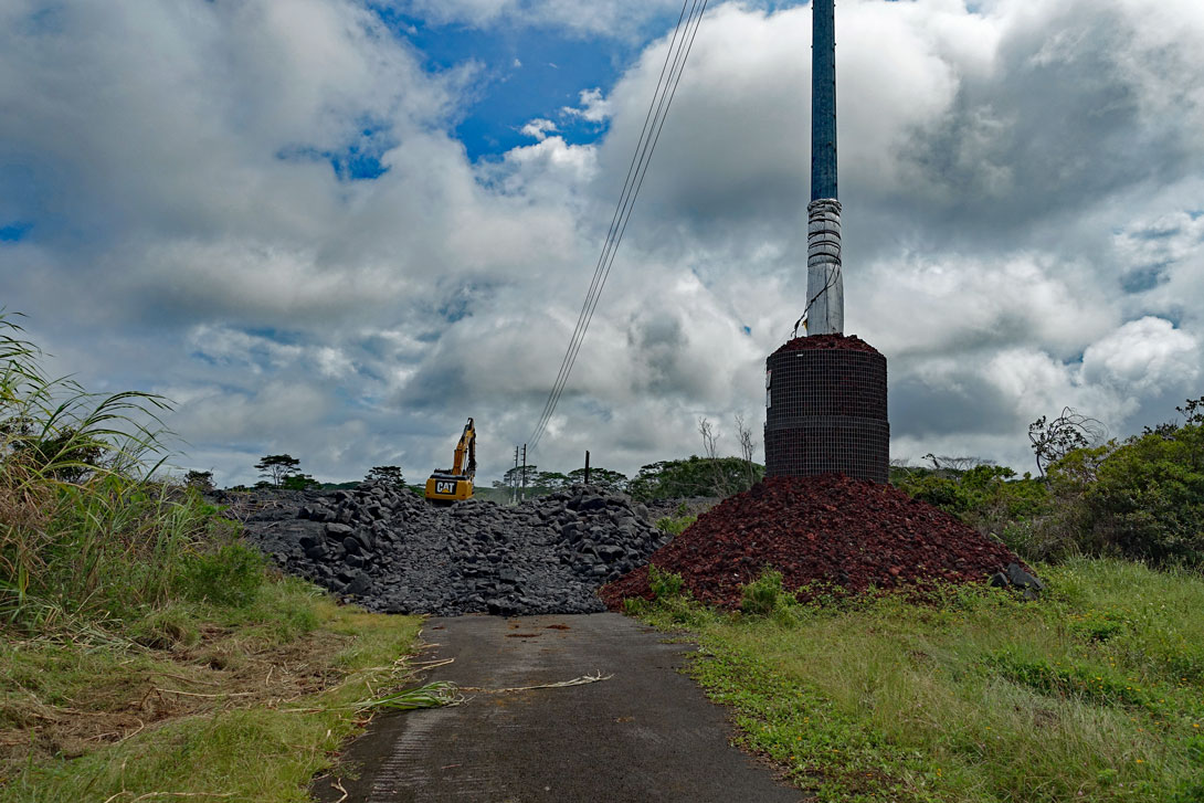 Bei einem erneuten größeren Ausbruch des Kilauea am 27.Juni 2014 floss die Lava wieder in zwei Strömen den Berg hinunter, bis sie im Dezember in Pahoa zum Stillstand kam. Man kann sich die Lavamassen anschauen, die in Pahoa über die Apaa Street geflossen sind, wenn man über Hilo nach Pahoa fährt. Das ist schon ein Erlebnis, wenn man vor den Strommasten steht, die mit dicken Steinen und Drahtverhau gesichert wurden, damit die Lava gezwungen wird, drum herum zu fließen. Ich war später noch einmal dort auf der Straße, die zu diesem Zeitpunkt mit einem Bagger wieder freigeräumt wurde. Auf der Fotostrecke können Sie das gut erkennen: