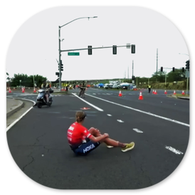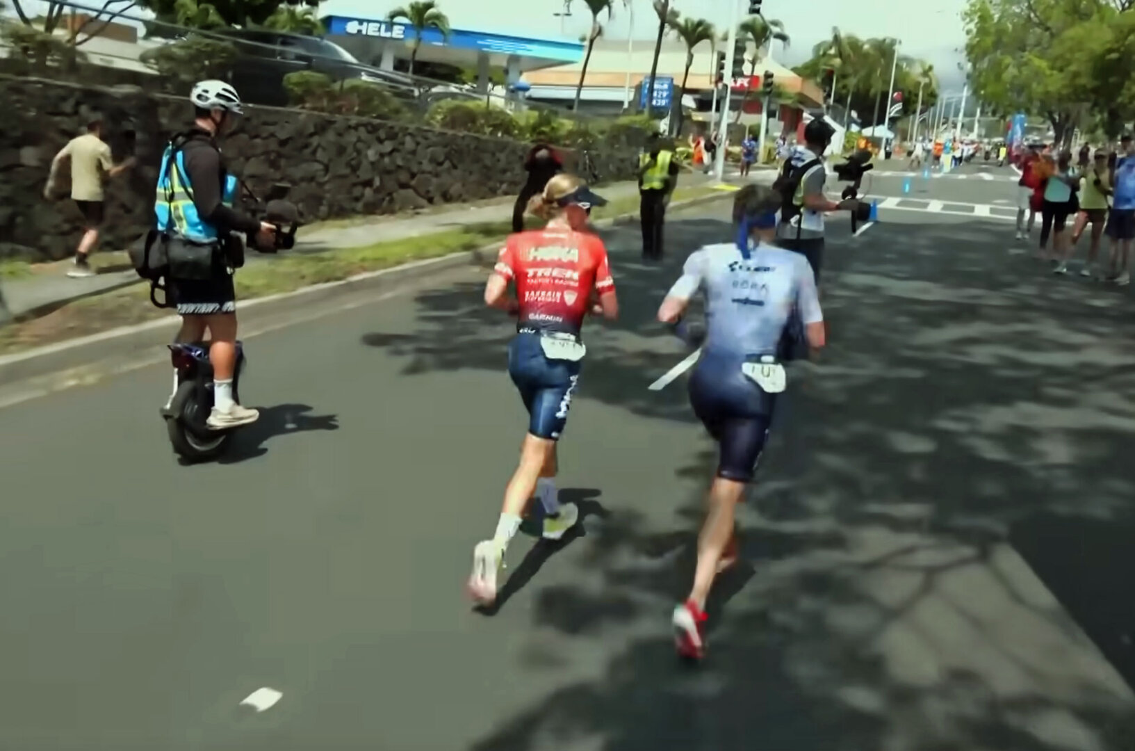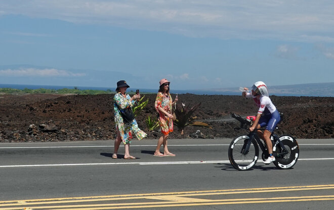 Ich stand mit meiner Schwiegertochter Doris und ihrer Freundin Kathrin an der Verpflegungsstelle beim Mauna Lani Resort am Highway, als sie als erste angeschossen kam und wenige Meter hinter ihr Taylor Knipp auf ihrer bunten Rennmaschine. Alles ging so schnell, dass ich kaum ein Foto machen konnte.
