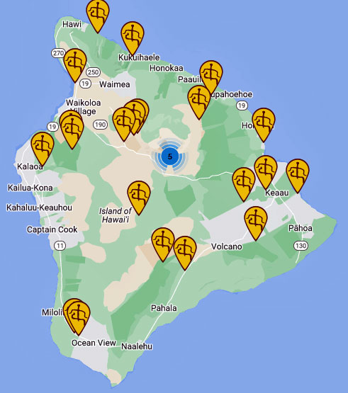 Es gibt eine fantastische Website All Trails mit ausführlichen Beschreibungen, Fotos und interaktiven Karten. Die sollten Sie sich unbedingt anschauen. Die folgende Übersichtskarte der Big-Island Trails stammt von dieser Website