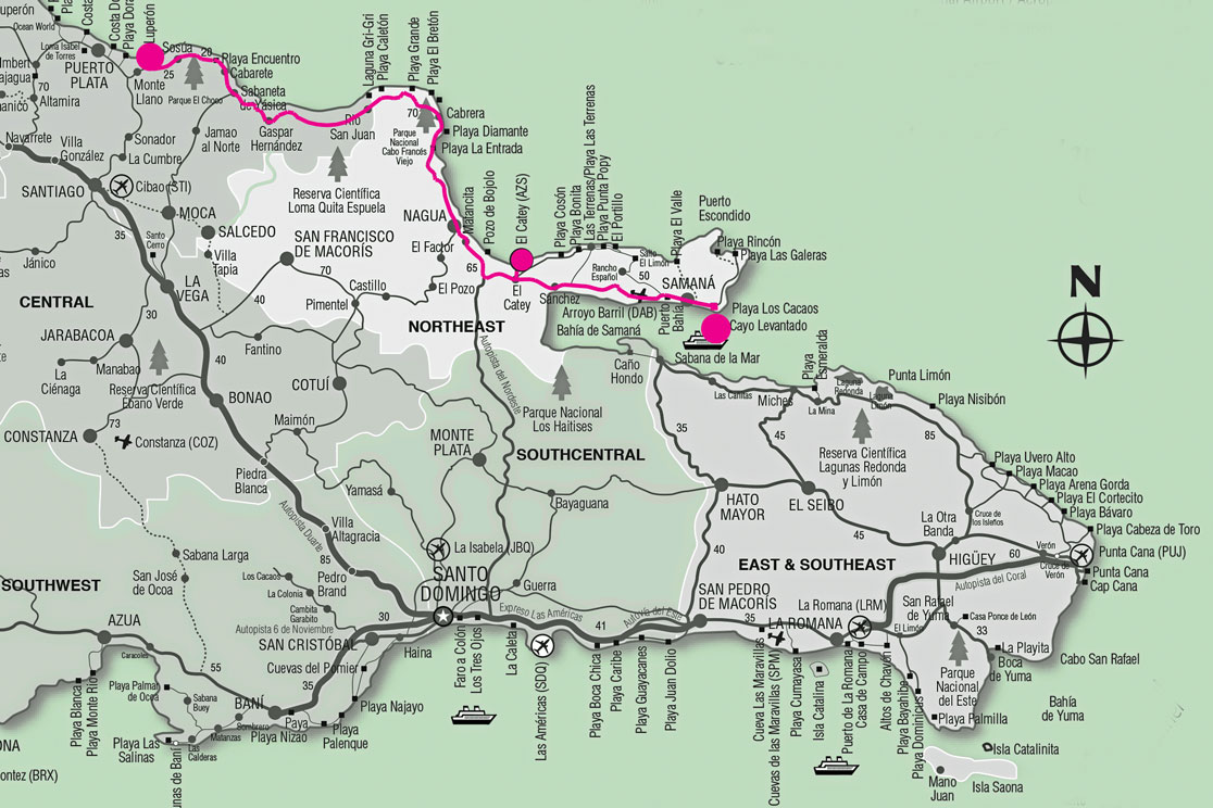 Die kleine Insel Cayo Levantado liegt im Süden der Halbinsel Samaná in der Dominikanischen Republik. Wir sind einmal in Samana gelandet und waren von dort in einer Stunde am Anleger Simi-Baez, der gegenüber der Insel liegt. Das zweite Mal sind wir in Puerto Plata gelandet und haben für die 240 km zum Anleger etwas mehr als 3 Stunden gebraucht. Wer von Santo Domingo anreist, benötigt für die 180 km lange Strecke fast die gleiche Zeit, weil man zwar den größten Teil über die Autopista del Noroeste relativ schnell voran kommt, dann aber von Catey aus über die viel befahrene Landstraße bis zum Anleger Simi-Baz fahren muss.