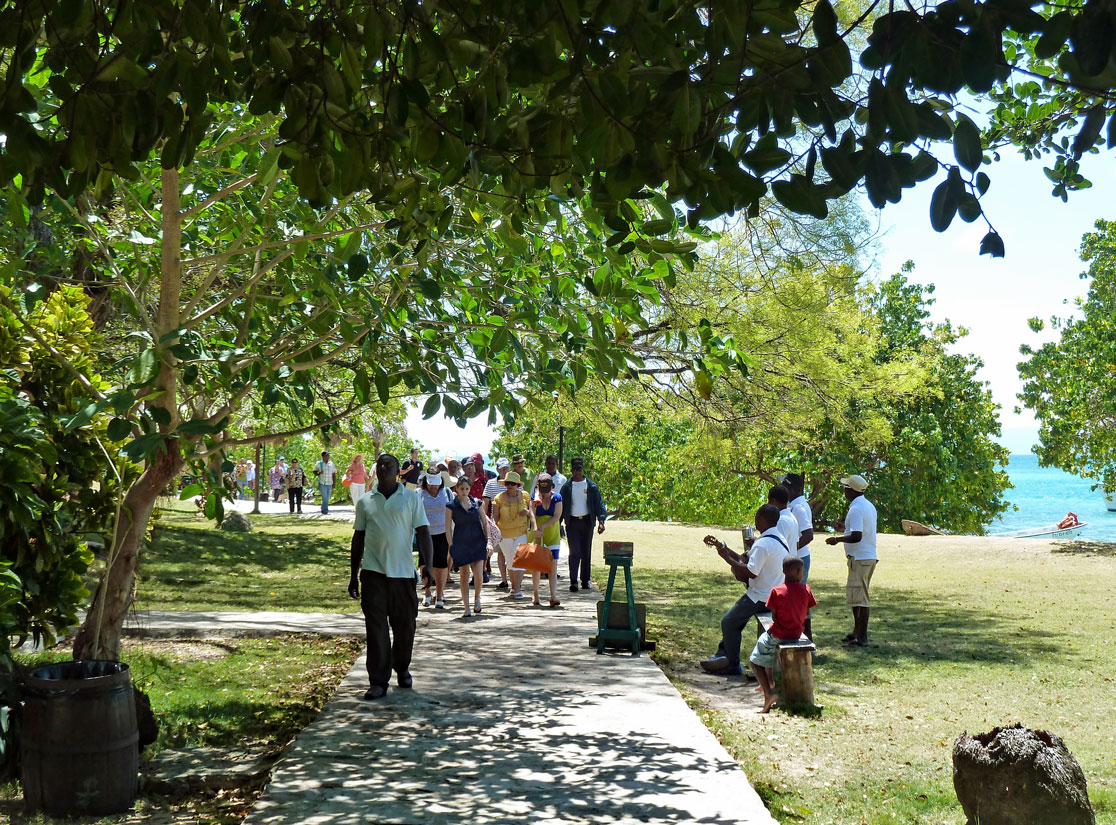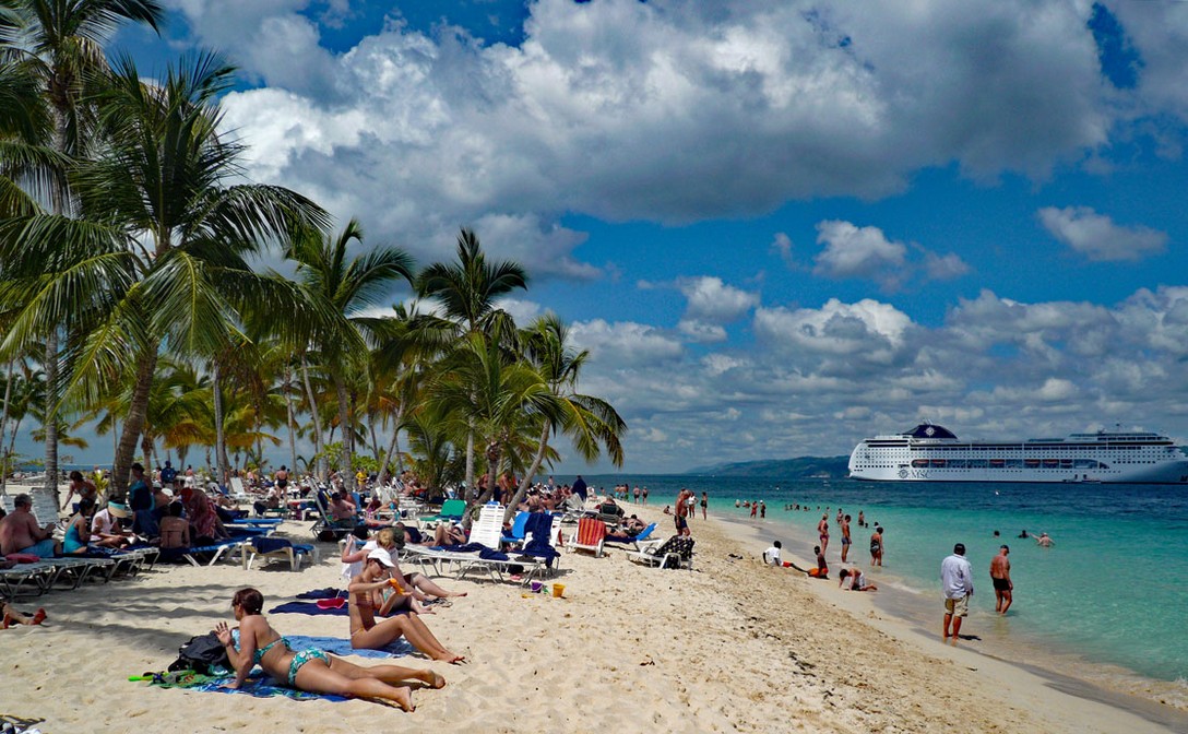 Wenn die Kreuzfahrtschiffe in Sicht sind, erwacht das kleine Inseleckchen zu voller Geschäftigkeit: Jetzt werden zig Souvenirstände, Strandbars und Fotostände aufgebaut, um den Kreuzfahrern ein Erlebnissouvenir mit auf das Schiff zu geben. Die Barkassen kommen in regelmäßigen Abständen und es dauert nicht lange, bis 1000 oder mehr Urlauber am Strand sind. Eine Begrüßungskapelle spielt karibische Rhythmen und in kürzester Zeit sind die 200 Liegen belegt. Wer keine mehr bekommt, legt sich mit dem mitgebrachten Handtuch in den Sand.