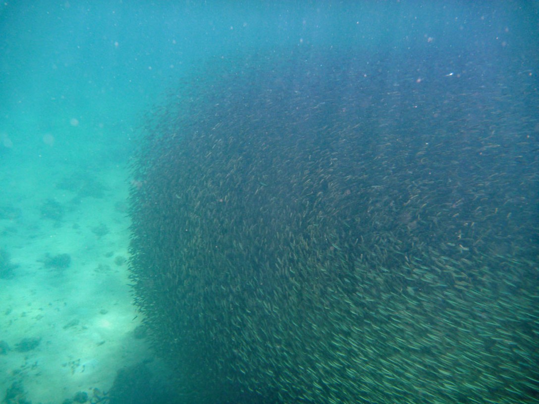 Das ist gar nicht so leicht, denn die winzigen Fische bewegen sich relativ schnell. Sie sind nur zwischen 3 und 10 cm groß. Schnappen kann man keine, weil sie zu flink sind. Wenn man an den Schwarm herantaucht, sieht er zunächst aus wie eine Kugel oder eine Ellipse, die aus Tausenden von kleinen Fischen besteht und immer in Bewegung ist. Man hat den Eindruck, als wälze sich der gewaltige Ballen langsam über den Boden oder durch das Wasser. Ich bin einmal unter Wasser an einen solchen Schwarm heran geschwommen, der sich wie eine riesige Kugel über den Meeresboden wälzte. Die Wasserhöhe betrug etwa 3 m und die Fischkugel bewegte sich manchmal ganz langsam, manchmal plötzlich ungeheuer schnell durch das Wasser. Auch die Höhe war unterschiedlich. Als ich dann mit meiner Camera in den Schwarm hinein geschwommen bin, umschloss er mich völlig und es wurde total dunkel. Das war sogar irgendwie beängstigend, weil ich nichts mehr sehen konnte. Ich schwamm dann nach oben und entdeckte die Schwimmflossen eines Pelikans, der einen Meter über dem Schwarm an der Wasseroberfläche schwamm und den Schwarm unter sich beobachtete. Da kam er natürlich nicht an die Fische heran, weil die noch zu tief waren.
