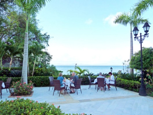 Das ist der Blick von unserem Zimmer auf die Hotelterrasse. Die Hotelterrasse ist das Zentrum des Hotels, denn hier werden die Tische für das Frühstück und das Abendessen gedeckt. Die werden vornehmlich von den Gästen genutzt, die nicht im Innern ihre Mahlzeiten einnehmen wollen. Drinnen ist es nämlich klimatisiert und entsprechend kühl.