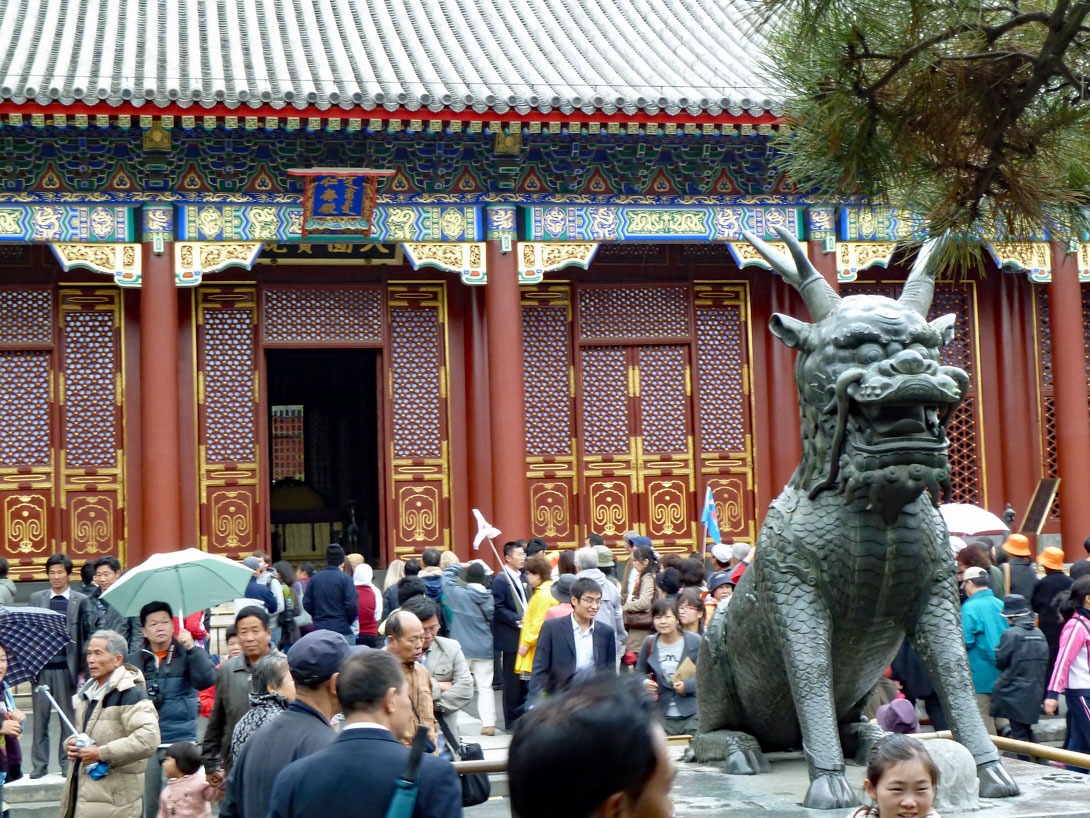 Im hinteren Teil des Palastes sind nicht mehr so viele Leute zu sehen, so haben wir auch die Möglichkeit, die bronzenen Löwen, die vergoldeten Löschwasserkessel und viele der kunstvollen Drachenfiguren ohne störende Touristen zu fotografieren. Wir steigen über viele abgewetzte Marmortreppen, Brücken und Querbalken auf den Fußböden, die die Geister fernhalten sollen. Als Wächter stehen Drachen, Löwen oder furchterregende Fabeltiere an den Treppenaufgängen.