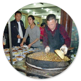 Zum Schluss macht zur Verdauung das Kännchen mit dem 58%igen Reisschnaps seine Runde, den wir ja inzwischen kennen und der uns immer besser gefällt. Mehr als ein Kännchen ist aber leider nicht drin, denn Liu kommt und sagt, der Bus stehe draußen und wir müssten einsteigen.