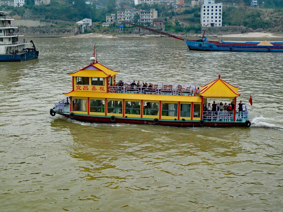 Der Flug von Shanghai nach Yichang mit Shanghai Airways startet nicht pünktlich um 15:40 Uhr, sondern erst um 16:32 Uhr, sodass wir noch zwei Stunden warten müssen. Dann geht es aber zügig los und wir sind nach einer Stunde und vierzig Minuten da. Es ist schon dunkel und wir müssen noch eine Stunde mit dem Bus fahren in ein chinesisches Hotel fahren, das ein Restaurant mit 500 Sitzplätze an 10er Tischen hat.