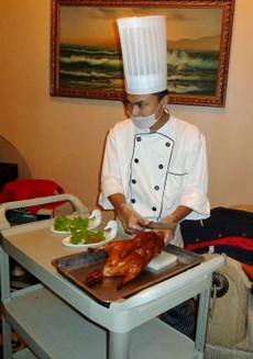 Diese nach dem obigen Verfahren vorbereitete Ente wird vom Koch zunächst den Gästen gezeigt und von ihm wird die Haut in gleichmäßige dünne Scheiben geschnitten und dem Gast serviert. Der legt diese mundgerechten Scheiben auf hauchdünne Pfannkuchen, die er mit einer schokoladenartigen Soße bestrichen hat. Darauf werden feine Lauchstreifen geschichtet und anschließend wird alles eingerollt, sodass es wie eine Frühlingsrolle aussieht. Der Fachmann macht das alles mit Stäbchen, was natürlich eine Kunst ist. Wir lernen es von der Kellnerin, die uns das vormacht. Hier das Video davon: