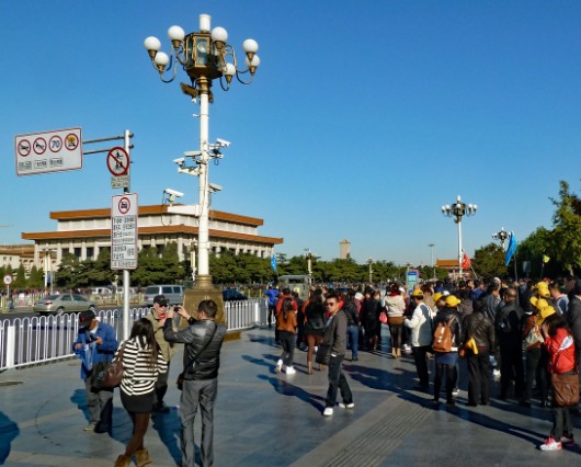 Dennoch schaffen es die Chinesen, die riesigen Menschenmassen überall durch die Security-Kontrollen zu schleusen, ohne dass es große Verzögerungen gibt. Hier unter dem Platz ist eine U-Bahnstation. Natürlich muss jede Tasche durch den Röntgenapparat geschoben werden. Auf der anderen Seite geht die Treppe unter der Hauptstraße hindurch zum Kaiserpalast - auch hier die gleiche Kontrolle. Beim Eingang zum Kaiserpalast: Wieder eine Kontrolle. Und so fort. Auf allen Straßenkreuzungen finden wir wie in den Kaufhäusern kleine, dunkle, halbrunde Kugeln mit Kameras. Wenn wir auf der Autobahn fahren, blitzt es in gewissen Abständen und der Fahrer erklärt uns, dass er wieder fotografiert worden ist. Aber irgendwie lässt es sich auch damit leben. Wir stellen jedenfalls fest, dass China trotz allem sehr weltoffen geworden ist.