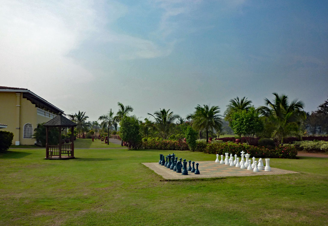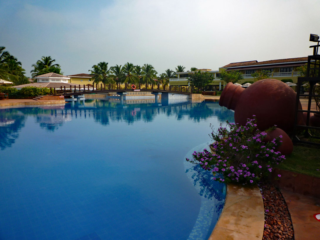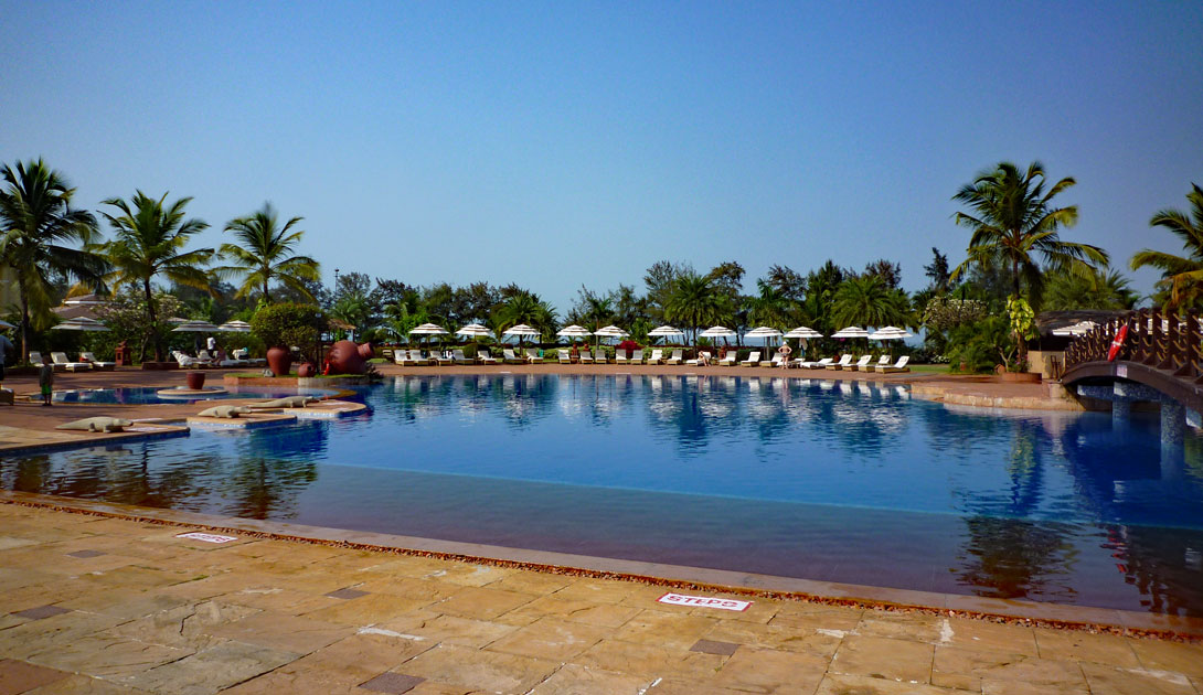 Die Hotelanlage ist sehr großzügig angelegt. Es gibt eine große Pool-Landschaft mit mehreren Becken, einer Pool-Bar und einem angedeuteten Wasserfall. Dazu genügend bequeme Liegestühle, Auflagen und Sonnenschirme. Alles sehr schön, wäre da nicht die indische Komponente dabei: Das sind die Krähen, die krächzend über die Anlage umherfliegen, sich überall niederlassen und von niemandem gestört werden, weil diese intelligenten Vögel ja hochrangige Götter sind, deren Gestalt wir im nächsten Leben durchaus annehmen könnten. Dass sie mit ihrem Kot alle Liegen, die Tische und den Boden beschmutzen, nimmt man gelassen hin. Dafür kommt dann eben alle fünf Tage der Hochdruckreiniger zum Zuge, der die Anlage geräuschvoll wieder von allen gelblich-weißgrauen Ablagerungen säubert.
