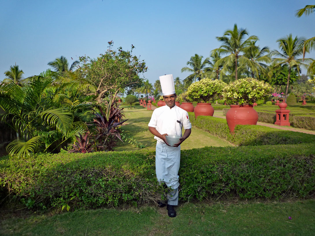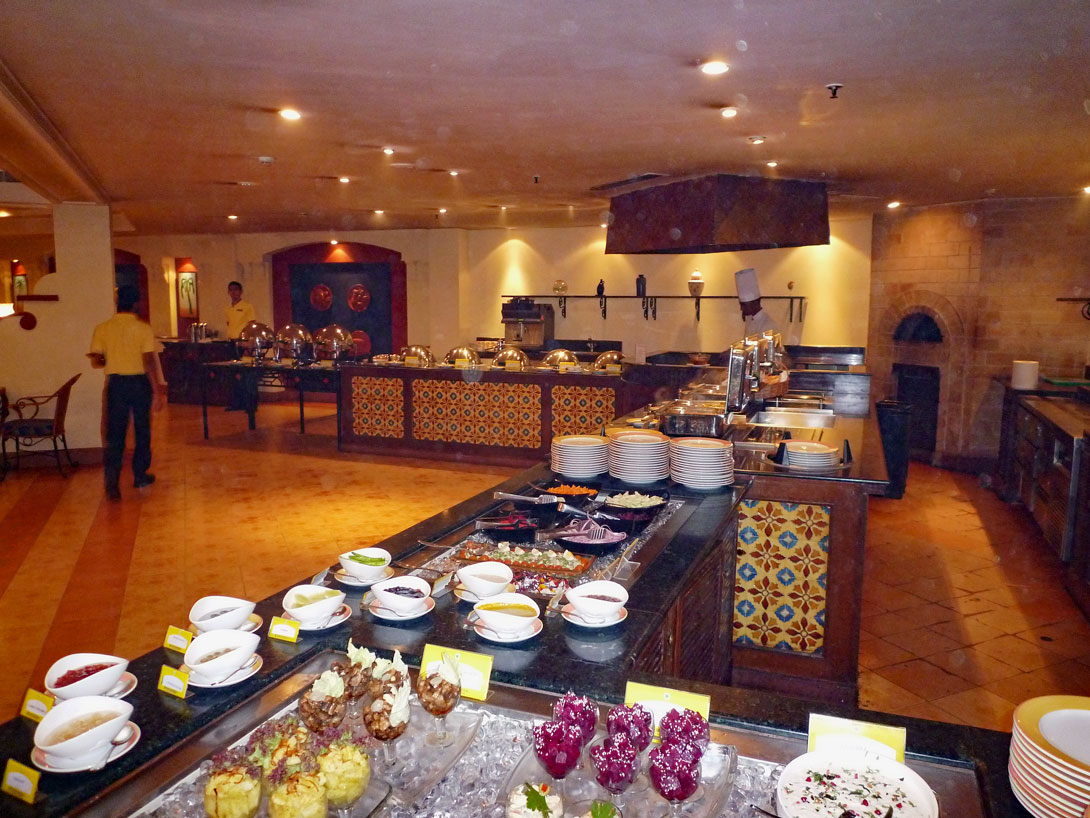 Das Buffet ist vom Feinsten. Das beste, das wir auf der gesamten Reise gesehen haben. Man kann sich nicht beklagen; allerdings ist alles indisch ausgerichtet, es gibt keine Rücksicht auf europäische Geschmacksnerven. Alles ist so scharf gewürzt, dass man oft nicht unterscheiden kann, ob es Fisch, Fleisch oder Tofu ist. Für Fans der indischen Küche ein Traumhotel. Es ist immer ein Koch da, der nach eigenen Wünschen das brät, was er vor oder neben sich liegen hat. Wir sind völlig perplex über die günstigen Preise für die Getränke, denn für das Budweiser Bier bezahlen wir 125 Rupien (das sind ungefähr 2 €). Traumhaft günstig für ein 5-Sterne-Hotel.