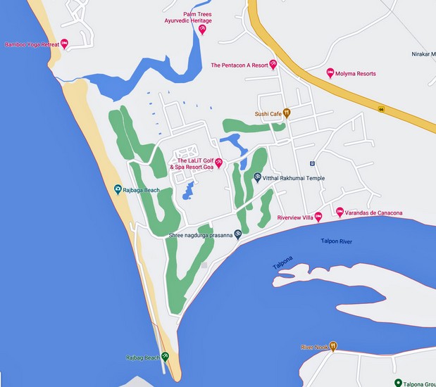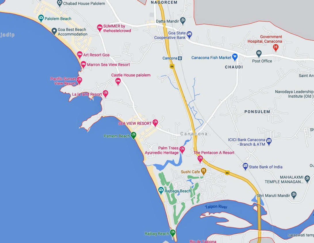 Die Lage der Strände kann man auf der folgenden Google- Karte gut erkennen: Der südlichste Strand (RajBaga Beach) gehört zum Lalit Hotel, darüber ist der Patnem Beach mit einigen Häusern und kleinen Hotels.