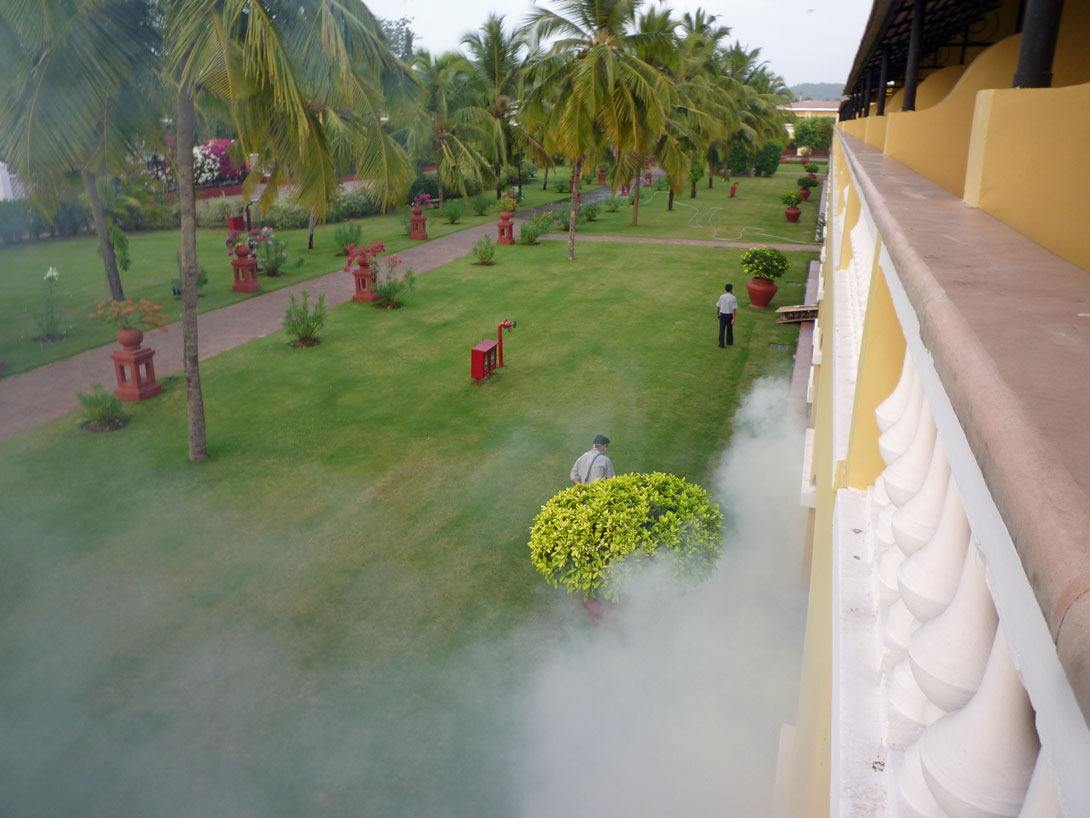 Besonders angenehm ist jedoch, dass keine Moskitos, Fliegen, Spinnen oder Käfer zu finden sind, wie wir das sonst aus den Tropen gewöhnt sind. Vielleicht liegt es an der Jahreszeit oder der unerträglichen Hitze oder den Krähen, die jedes Ungeziefer wegfressen. Vielleicht liegt es aber auch an den Gärtnern, die morgens in aller Frühe mit der Giftspritze weiße Wolken von DDT an den Hauswänden hinaufsteigen lassen, sodass uns die Luft wegbleibt.