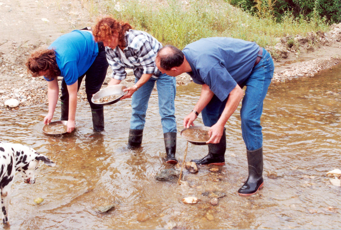 Das Geheimnis des richtigen Goldwaschens, des "pannings" liegt darin, dass man die Schüssel mit dem goldhaltigen Erdreich und Wasser richtig schwenkt.. Nach und nach sortieren Sie die dicken Steine aus, dann die Schlammteile und kleinen Bestandteile. Immer wieder kommt frisches Wasser dazu, bis Sie schließlich am Boden die kleinen Goldkörnchen oder Goldplättchen durch das Wasser schimmern sehen. Und die richtige Schwenktechnik ist gar nicht so schwer. Aber lassen Sie sich diese genau zeigen. Erst unter fachkundiger Anleitung wird es leicht und erfolgreich!