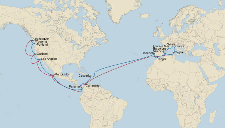 Unter den Frachtschiffen, die eine günstige Route haben, um einen der Häfen an der amerikanischen Pazifikküste zu erreichen, ist die Cap Jackson, die von mehreren europäischen Häfen aus den Atlantik überquert, durch den Panamakanal fährt und die westamerikanischen Häfen anläuft, wo die Kreuzfahrtschiffe nach Hawaii ablegen.Das wäre die ideale Kombination für die Nichtfliegerin oder den Nichtflieger,. Leider ist die Reederei Hamburg-Süd pleite, die eine ganze Flotte von solchen Containerschiffen besaß, die auch von Hamburg starteten.
