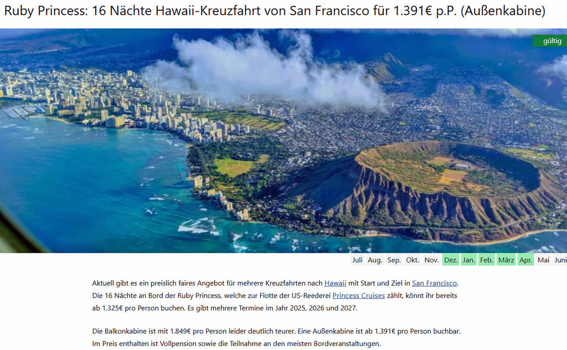 Die Holland America Line bietet im Dezember 2025 eine 17tägige Kreuzfahrt mit dem Schiff Zaandam von San Diego nach Hawaii an.; außerdem im April 2025 und Oktober 2025 mit dem Schiff "Koningsdam" eine attraktive 17-tägige Kreuzfahrt ab Vancouver an. Es muss aber nicht unbedingt nur Hawaii sein, wenn Sie die Südsee kennen lernen wollen. Die Holland-America-Line bietet zum Beispiel mehrere Kreuzfahrten über Hawaii nach Polynesien an, die sehr attraktiv sind. Das ist interessant für diejenigen, die außer Hawaii die polynesischen Inseln erkunden wollen. Die sind wirklich toll, das kann ich aus eigener Erfahrung nur bestätigen. Schauen Sie auf der Website von Holland-America-Line nach, welche Angebote es gibt.