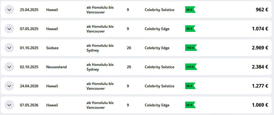 Günstige Angebote gibt es immer wieder. Sie finden Sie bei Dreamlines.de und bei Kreuzfahrtberater. Der hat für 2025 und 2026 mehr als 300 Vorschläge für Sie.