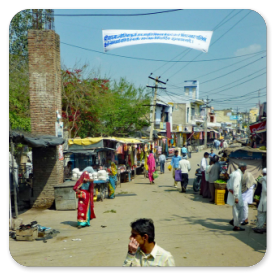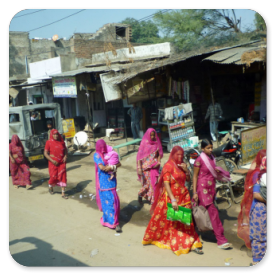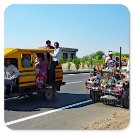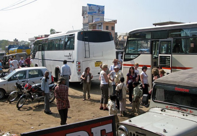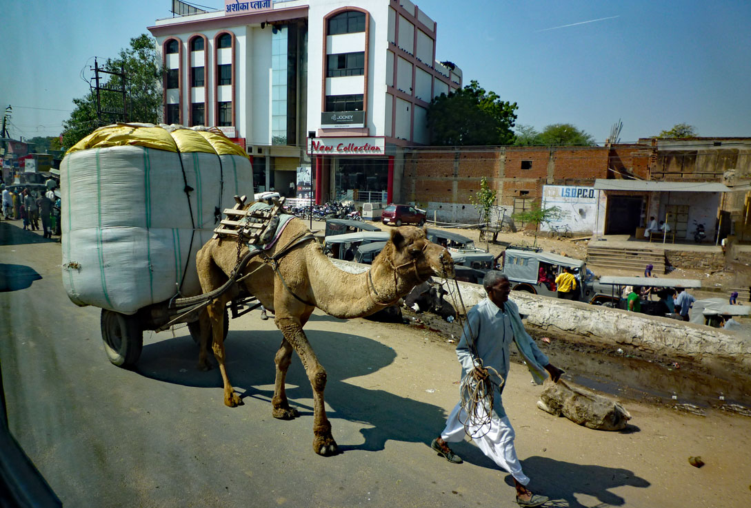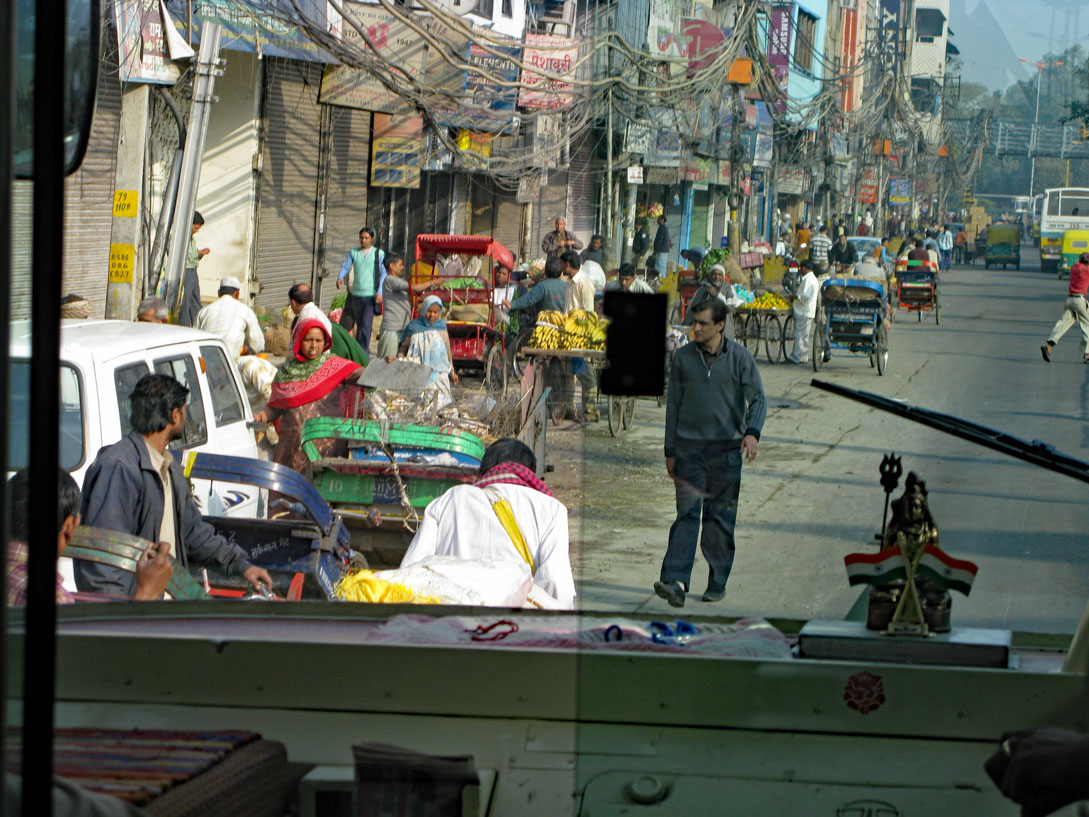 Schon bei der Abfahrt bekommen wir einen Vorgeschmack von den vollen Straßen. Zunächst quälen wir uns durch den dichten Verkehr in Delhi, der dauernd ins Stocken kommt. Die Ausfallstraßen aus Delhi sind zwar fast alle vierspurig, aber hoffnungslos verstopft. Es herrscht Linksverkehr und wir müssen dauernd stehen bleiben. Die Wartezeit nutzen Verkäufer, die an die Busfenster klopfen, damit die Fahrgäste die Fenster öffnen und etwas kaufen. Sie stehen überall - an den Ampeln, Kreuzungen und Staustellen. Besonders viele Kinder sind darunter.
